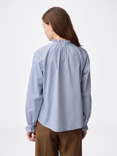 GUの「フリルネックブラウス」は、襟元と袖にあしらわれたフリルが華やかなアクセントとなり、シンプルながら上品な印象を演出するブラウス。レギュラー丈に加えてラウンドした裾が特徴で、アウトスタイルでもバランスよく着こなせます。レイヤードスタイルにも合わせやすく、コーディネートの幅を広げてくれるアイテムです。カラーは01 OFF WHITEと64 BLUEの2種類、価格は2290円で販売されています。なお01 OFF WHITEは透けやすいため、インナー選びに注意が必要です。