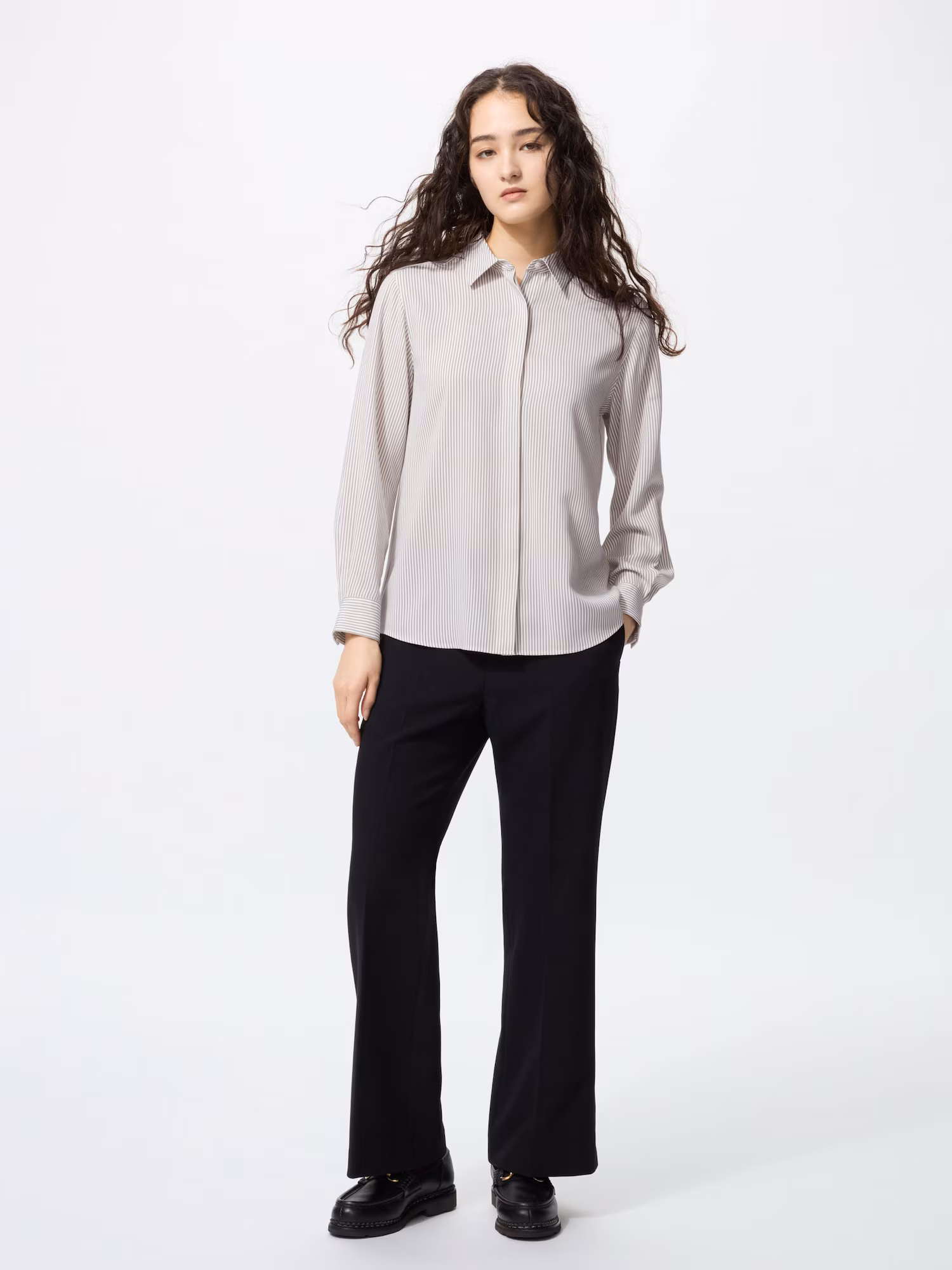 ユニクロの「レーヨンブラウス」は、素材にレーヨンとリサイクルポリエステル繊維を使ったブラウスです。肌ざわりがなめらかなで、洗濯後でもシワになりにくくお手入れが簡単なのもポイント。フロントは比翼仕立てとなっており、袖口にタックを増やすことでより繊細でクリーンなデザインにアップデートされています。さらに、ストライプのデザインがよりきちんと感のある印象を与えてくれるので、オフィスカジュアルにもぴったりです。