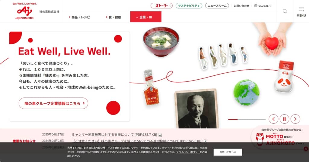 第1位は「味の素」でした。東京都中央区に本社を置く、1909年創業の食品メーカーです。「食品事業」と「バイオ&ファインケミカル事業」を柱に、幅広い事業をグローバルに展開。今後はアミノサイエンスで価値を共創する「ヘルスケア」「フード&ウェルネス」「ICT」「グリーン」の4つの成長領域で、より大きな社会・経済価値の創出を目指しています。