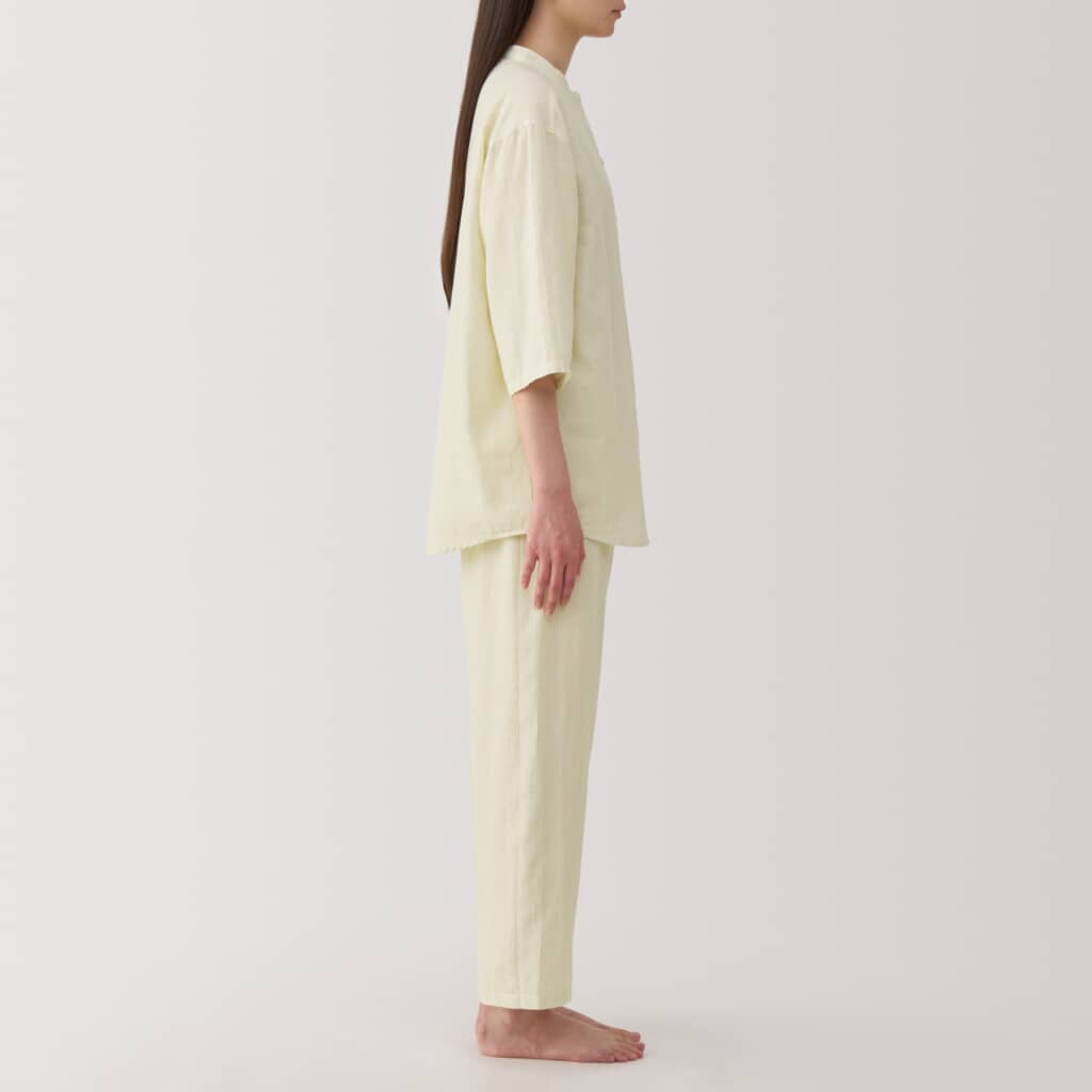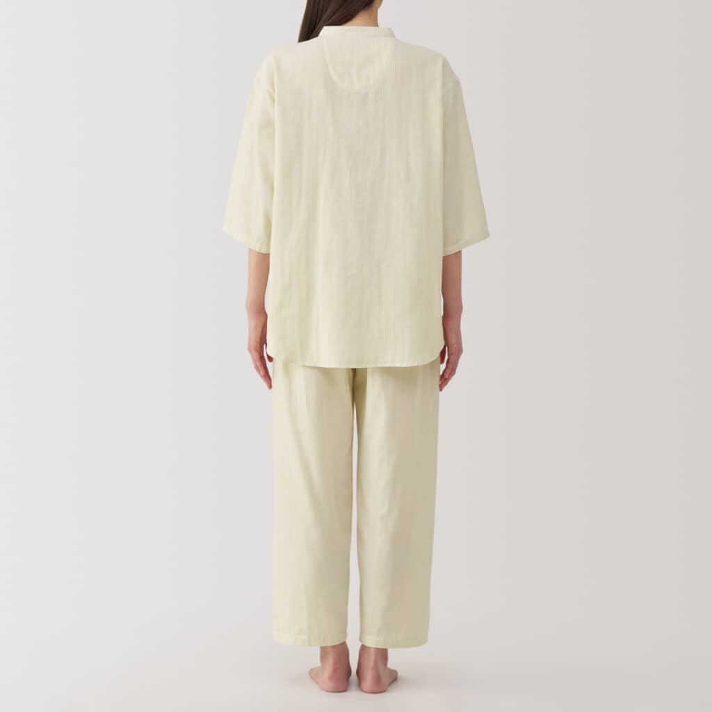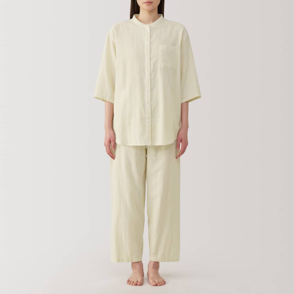 無印良品の「婦人 脇に縫い目のない 薄手ガーゼ七分袖パジャマ」は、清涼感のある二重ガーゼを使用し、着心地を考えて脇の縫い目やタグをなくした七分袖のパジャマ。素材には細い糸を二重に織り上げたオーガニックコットンを採用し、通気性が良く汗をかいてもベタつきにくいため、快適に過ごせます。