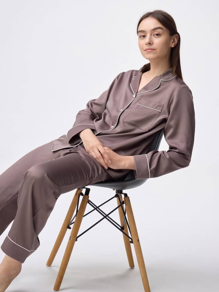 GUの「サテンパジャマ(長袖&ロングパンツ)」は、上品な光沢感となめらかな風合いが特徴のサテン素材を使用した上下セットのパジャマ。パンツには便利なポケットが付いており、実用性も兼ね備えています。カラーは12 PINK・38 DARK BROWN・69 NAVYの3種類、価格は2990円で販売されています。