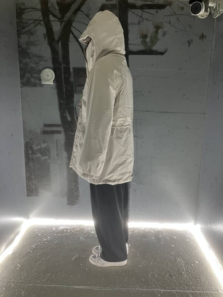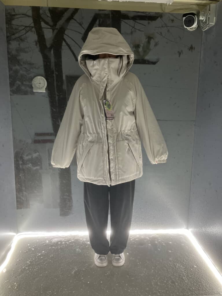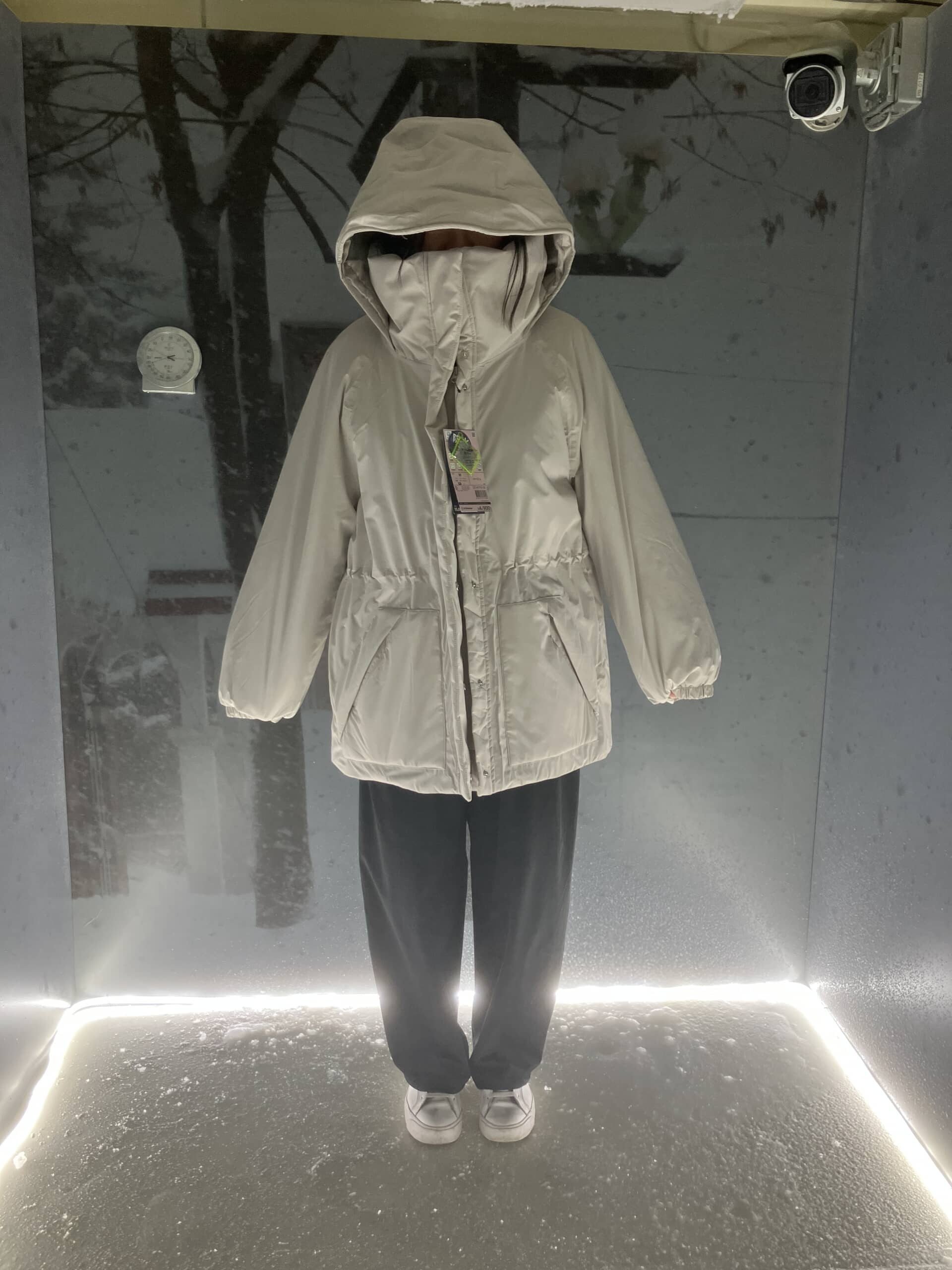 以下からは、極寒体験の画像と「エックスシェルター(R)断熱αレディース防水ウォームアウター」詳細画像、【ワークマン】今売れてる「撥水・防水アイテム」ランキングを紹介します!