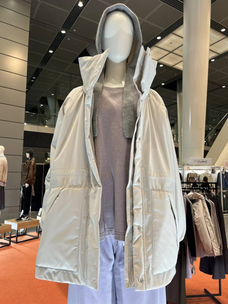 まずは、用意されたエックスシェルターシリーズの中から、自分に合ったアイテムを選んで着用します。事前に会場内を見て気になっていた「エックスシェルター(R)断熱αレディース防水ウォームアウター」をチョイス。