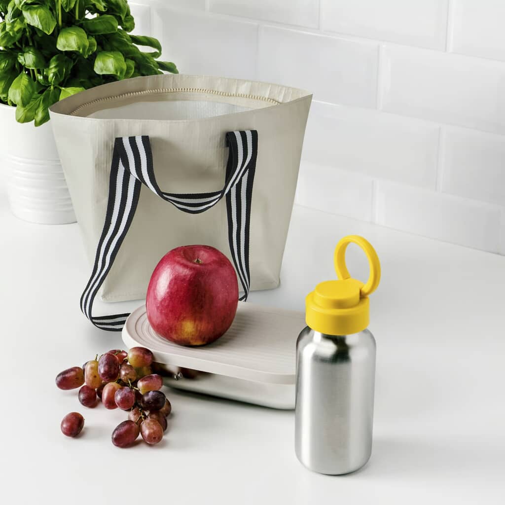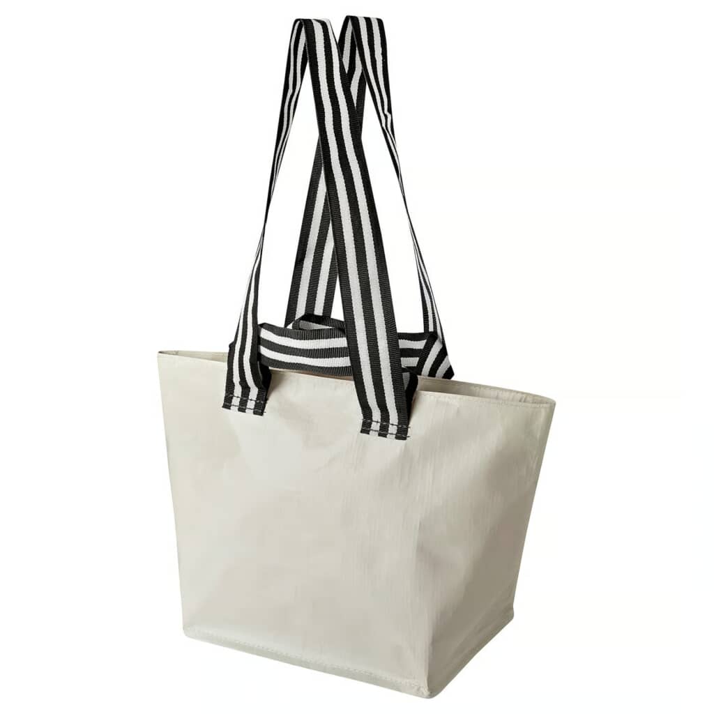 IKEAの「GÖRSNYGG ヨールスニグ」は、ライトベージュの本体カラーと白黒ストライプな持ち手カラーが特徴のキャリーバッグ。コンパクトなサイズ感ながらファスナー付きで、持ち手で手提げとして使えるほか、長いストラップを使えば肩から下げることもできます。使用後はたたんで省スペースに収納でき、ポリプロピレン素材なので水洗いして自然乾燥させるだけでお手入れできるのも魅力的。税込み249円という低価格なのもうれしいですね。