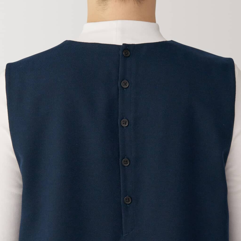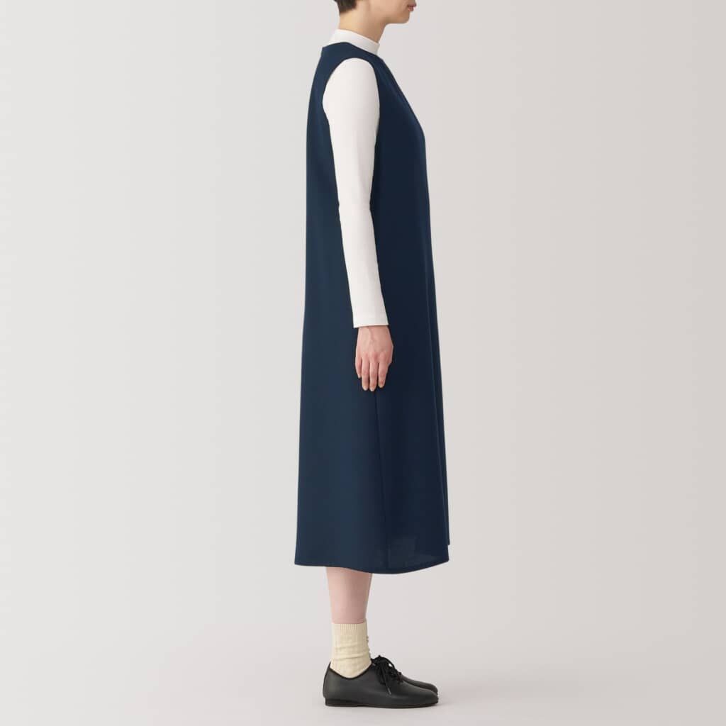 無印良品から販売されている「婦人 起毛 ジャンパースカート」は、ウールを取り入れた素材で仕立てた、あたたかみのあるワンピースです。チクチク感を軽減するよう工夫されており、自宅で洗える扱いやすさも魅力。デザインはクルーネックのすっきりとしたAラインで、背中には5つのボタンを配し、着脱のしやすさとアクセントを兼ね備えています。後ろのボックスプリーツにより足さばきが良く、動きやすさを実現。アームホールを広めに設計しているため、ニットを重ねても快適に着られる一着です。