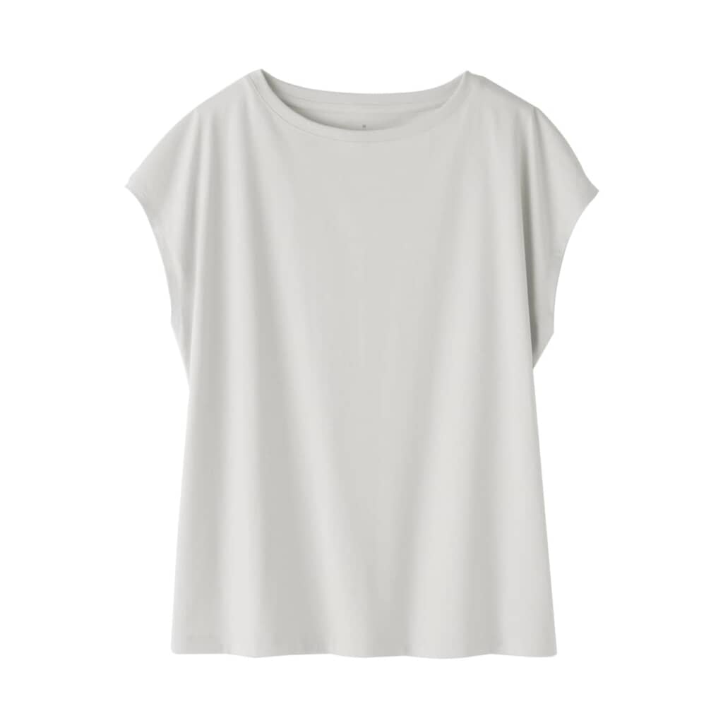 無印良品の「婦人 天竺編みフレンチスリーブTシャツ」は、綿と再生ポリエステルの混紡による天竺編み素材で仕立てられたTシャツ。綿特有の自然な風合いと、ポリエステルによる乾きやすさが同居した心地よい一枚です。デザインは、肩をすっきりと見せるフレンチスリーブ仕様に加え、ネックラインをすっきり演出する細めのクルーネックにアップデート。前作よりも襟元の開きを抑えたことで、シンプルでさわやかな印象を実現しています。