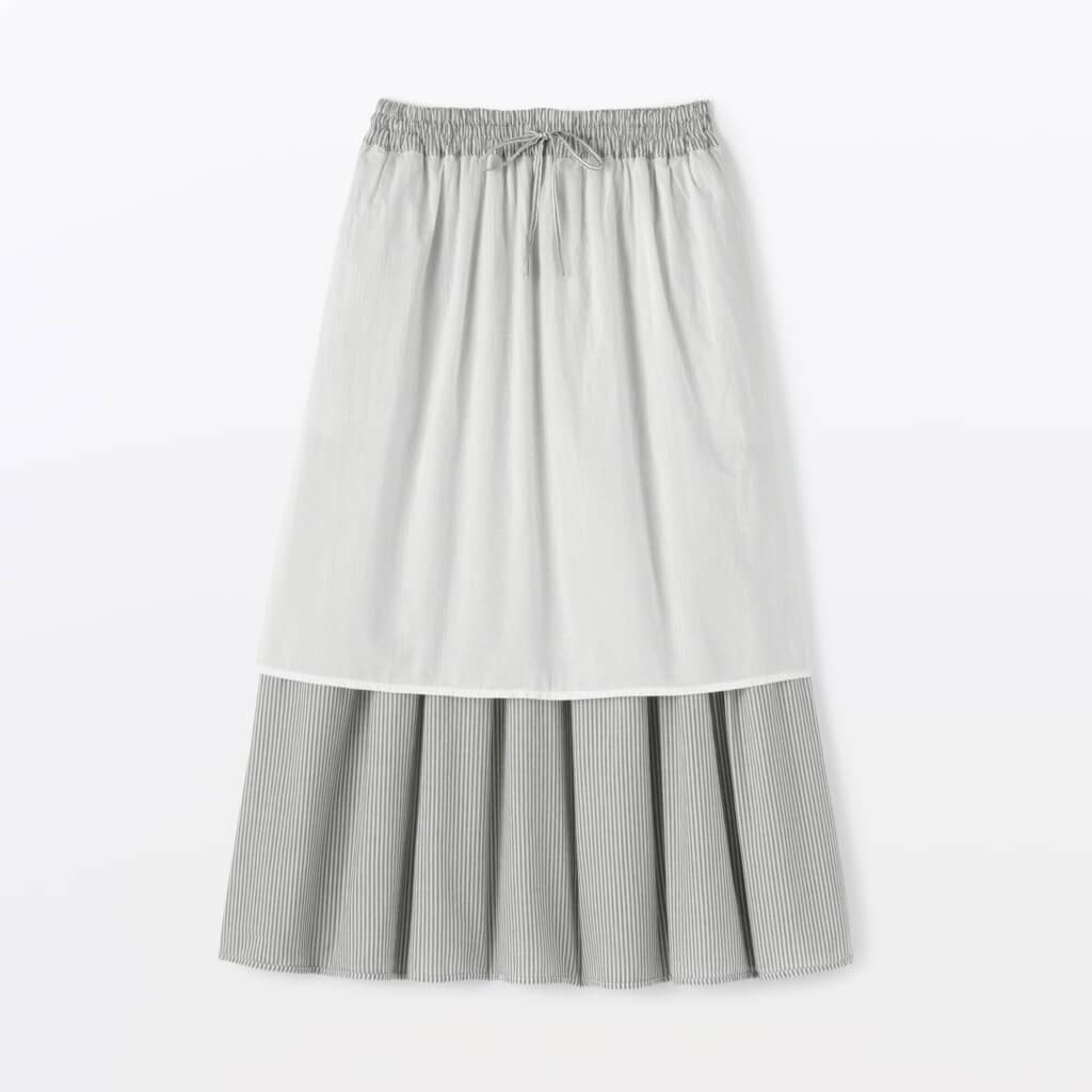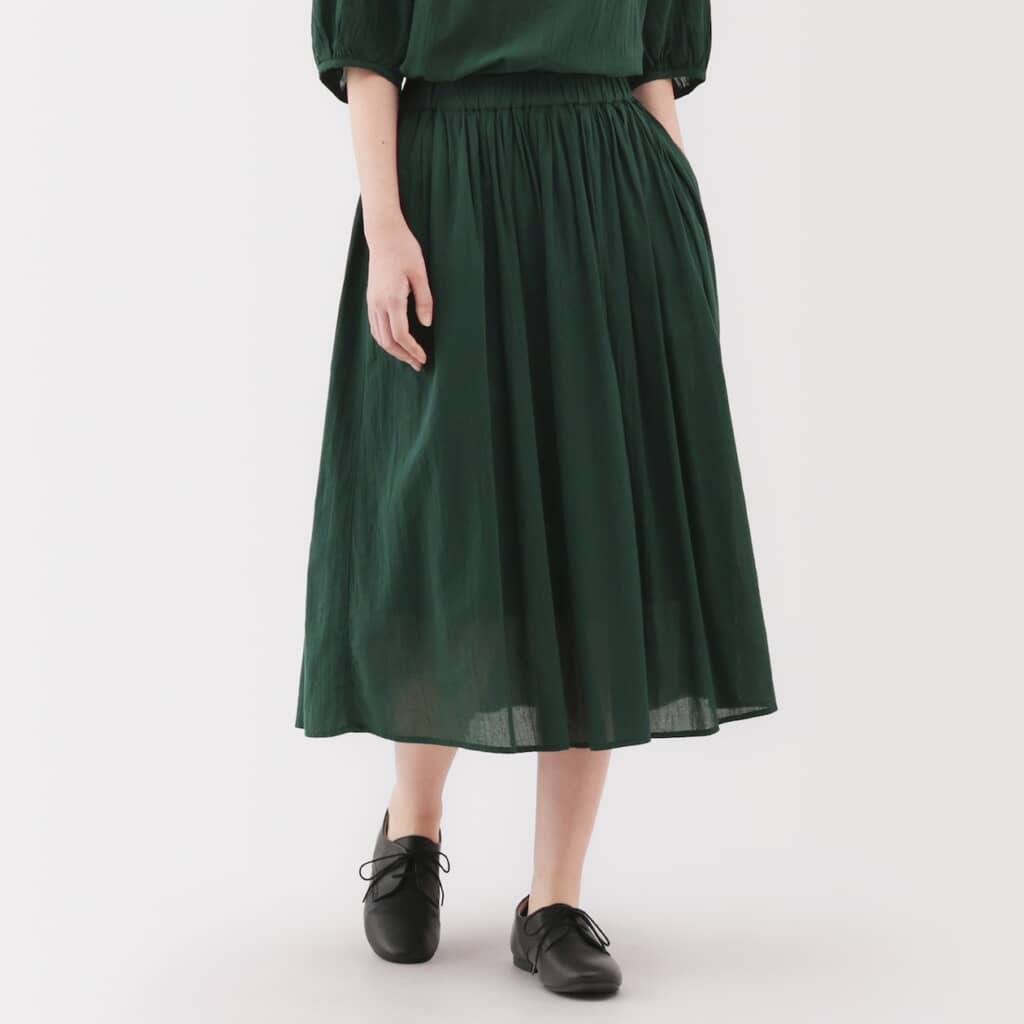 無印良品から販売されている「婦人 綿ボイル ギャザースカート」が、柔らかくて肌触りがよく、広がりすぎないギャザーがほどよく体型を隠してくれると高評価を集めています。