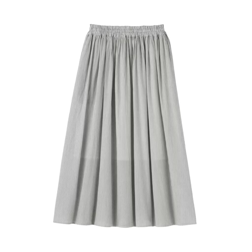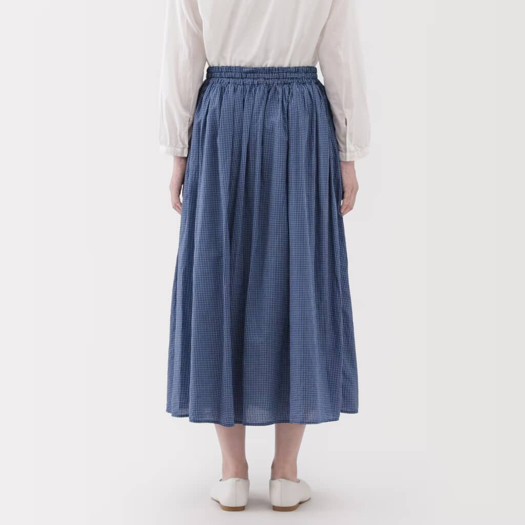 無印良品の「婦人 綿ボイル ギャザースカート」は、薄手の綿ボイル生地を使用した軽やかなはき心地が特徴のスカート。風をはらむような柔らかな素材感ながら裏地付きで透けにくく、安心して着られる仕様になっています。ウエストは総ゴム仕様に加えて内側の紐で調整ができ、体型や着用感に合わせてフィット感を整えられるのもうれしいポイント。カラーはライトグレーストライプ・ブルーチェック・ダークネイビーの3色、価格は税込み4990円で販売されています。
