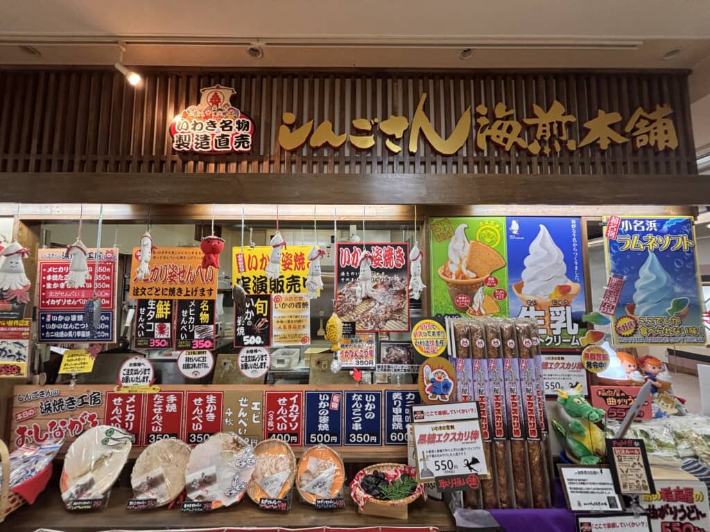 施設は2階建てで、1階には海産物店やお土産品店、多くのお食事処。中には「かりんとうまんじゅう」「凍み天」「巨大なプレス煎餅」など海鮮以外にも気になるグルメが味わえ、2階にもレストラン、「3.11いわきの東日本大震災展」の展示を行っており、津波被害を乗り越えた浜通り地方最大級の観光施設として過去の災害のことを後世に伝えています。