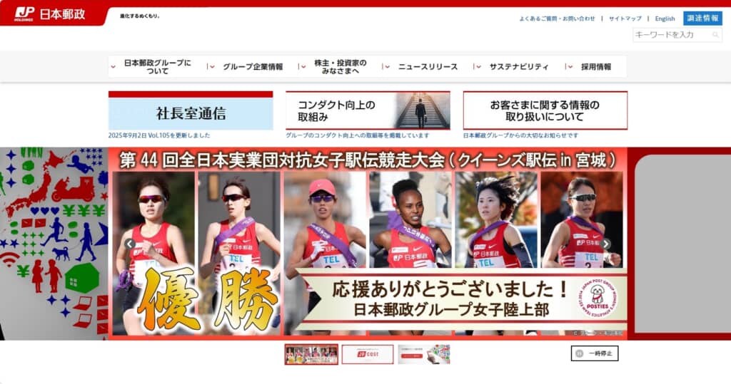 第1位は「日本郵政グループ(日本郵便)」でした。2007年に「日本郵政」「郵便事業」「郵便局」「ゆうちょ銀行」「かんぽ生命保険」の5社体制で発足した、日本郵政グループ。全国の郵便局ネットワークを通じて、郵便・貯金・保険の3つの事業を中心に、さまざまな商品やサービスを提供しています。