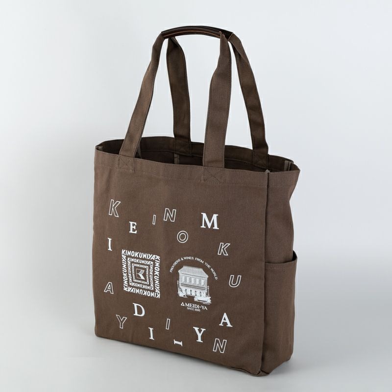 今回紹介する「【紀ノ国屋×明治屋】レザーハンドルコットンバッグ ブラウン」は、紀ノ国屋創業115周年と、明治屋創業140周年を記念したコラボレーションバッグ。上品なブラウンカラーのバッグのフロントには、両ブランドのロゴやアルファベットが散りばめられています。
