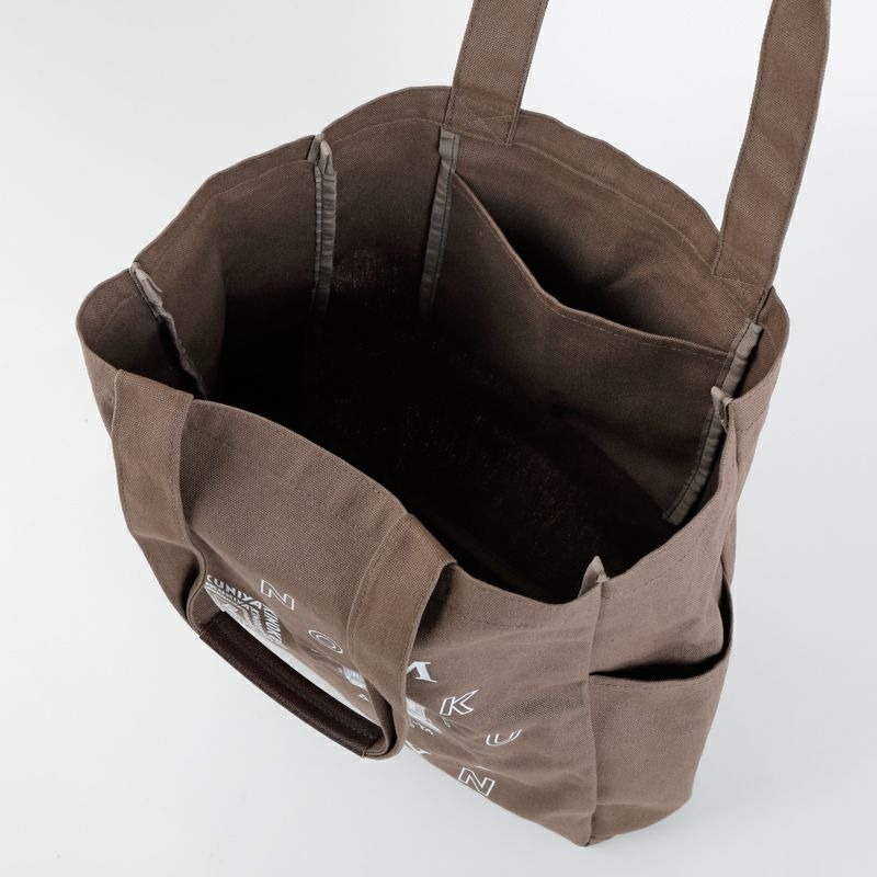 サイズは約タテ35×ヨコ35×マチ12センチと買い物からサブバッグまで幅広く使いやすい大きさ。本体生地には程よい厚みのある12オンスのコットンを使用し、持ち手はレザーハンドル付きで高級感があります。両サイドはうれしいポケット付きで、ペットボトルや折りたたみ傘などを入れるのにぴったり。さらに内ポケットも付いており、カードケースやスマホなど小物を入れるのに便利です。税込1980円で販売されています。