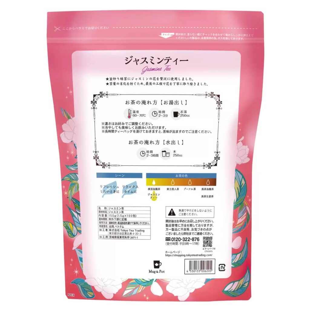 おやつタイムに一緒に楽しめる、コストコのお茶も高コスパでおすすめ。「Mug & Pot ジャスミン茶 1.5g X 100包」は、香り高く、日常使いしやすいティーパック入りジャスミン茶です。茶葉は台湾やベトナム産で、緑茶をベースに“新鮮なジャスミンの花”を贅沢に用い、仕上げの工程でジャスミンの花を丁寧に取り除いてからパッケージされているため、茶葉の劣化を抑えつつ香りや風味を保つ工夫がなされています。食後やリラックスタイム、中華料理のような味の濃い料理と相性抜群です。
