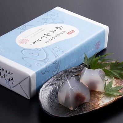 葛にわらび粉を加えて炊き上げた生地は、冷たい地下水で冷やされることでつるりとした食感に。中にはあっさりとした餡が包まれ、こし餡や抹茶餡といった定番のほか、月替わりでフルーツ餡など季節限定の味わいも楽しめます。
