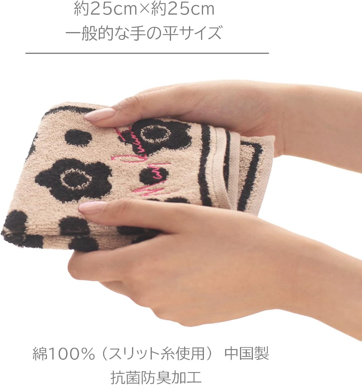 マリークワントの「タオルハンカチ」は、落ち着いたベージュのカラーにピンクの刺繍が映える上品なデザインです。綿100%のふんわりとした生地は吸水性に優れており、手洗い後の水分もさっと拭き取ることができます。デイジーとドットを組み合わせたブランドらしいパターンは、日常使いしやすい約25センチ角のスタンダードサイズ。さらに抗菌防臭加工が施されているため、いつでも清潔に使えるのも魅力です。
