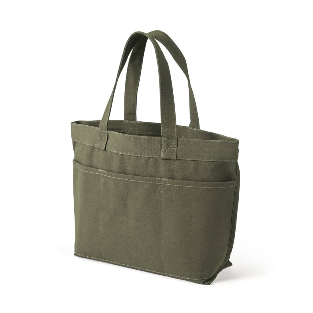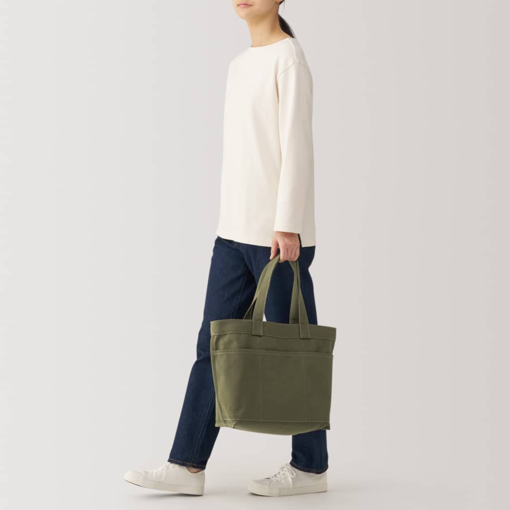 無印良品の「帆布 横型トートバッグ」は、オーガニックコットンの帆布生地を使用した、しっかりとした厚みのあるトートバッグ。サイズは縦31センチ×横46センチ×マチ14センチで約20リットルの収納力があり、普段使いからお出かけまで幅広く活躍します。外側に三つ、内側に二つのポケットを備えており、小物の整理がしやすい設計。カラーは黒・生成・カーキグリーンの3種類で、価格は税込み1490円で販売されています。