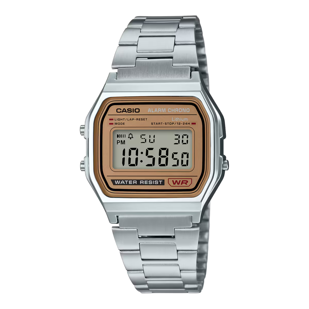 カシオコレクションの「A158WEA-9JH」は、シンプルながら存在感のあるレトロデザインの腕時計。ケースサイズは約縦3.68センチ×横3.32センチ×厚さ0.82センチ、質量は約44グラムと軽量。メタルバンドにはステンレススチールを採用し、クラシカルなデジタルフェイスを引き立てます。カラーはゴールドフェイスのほか、ブラックもあり、好みに合わせて選べます。