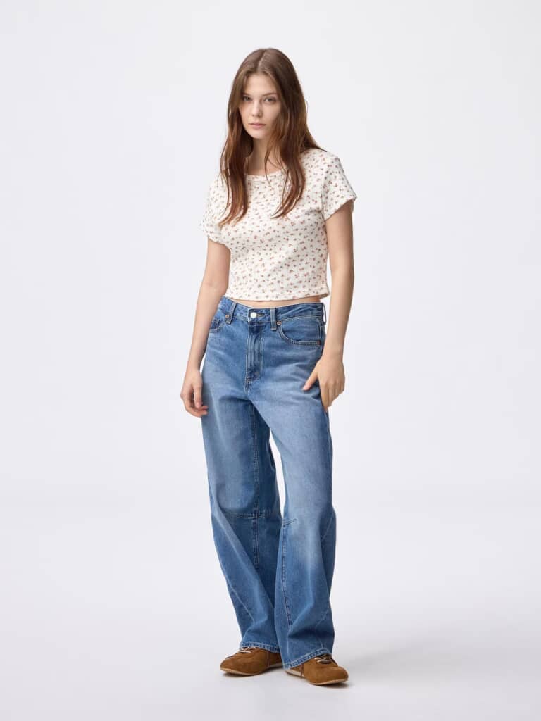 GUの「バレルレッグジーンズ(丈標準71.0~75.0cm)」は、絶妙な加工感が特徴のジーンズ。膝からワイドに広がりつつ裾へ向けて緩やかにテーパードさせたシルエットが特徴で、ボリュームとシャープさを両立しています。横のシームを前振りにすることで視覚的に重心を下げ、立体的なフォルムを演出。さらに膝内側に配したダーツがデザイン性を高め、加工の味わい深さとすっきりしたはき心地を同時に楽しめます。サイズによってシルエットが変わるので、自分好みの一本を見つけられるのもうれしいポイント。カラーは5種類、価格は2990円で販売されています。