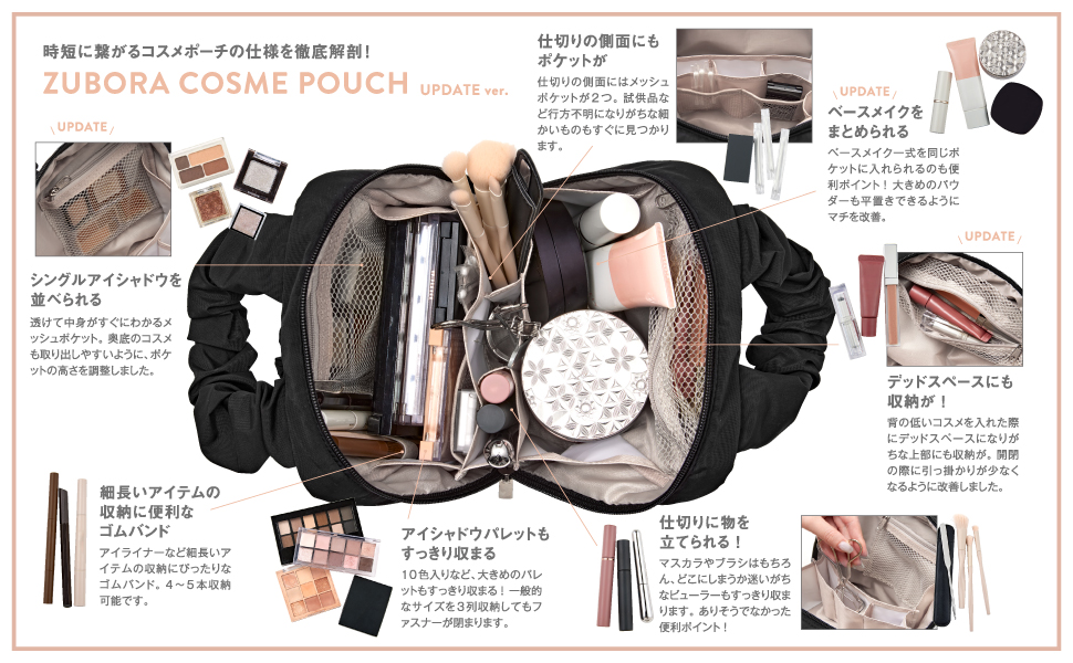 化粧水やリムーバーといった大きなボトルも立てて収納できる大容量タイプ。蓋の裏側はジッパー付きのメッシュポケットになっていて、デッドスペースになりやすいポイントも有効活用。マスカラやアイライナーを入れるのにちょうどいい縦型ポケットも3つ付いています。真ん中の仕切りは取り外し可能。口の部分は大きく開けられるダブルファスナー仕様です。サイズは、縦16センチ・横17センチ・マチ15センチ。税込3916円で販売されています。