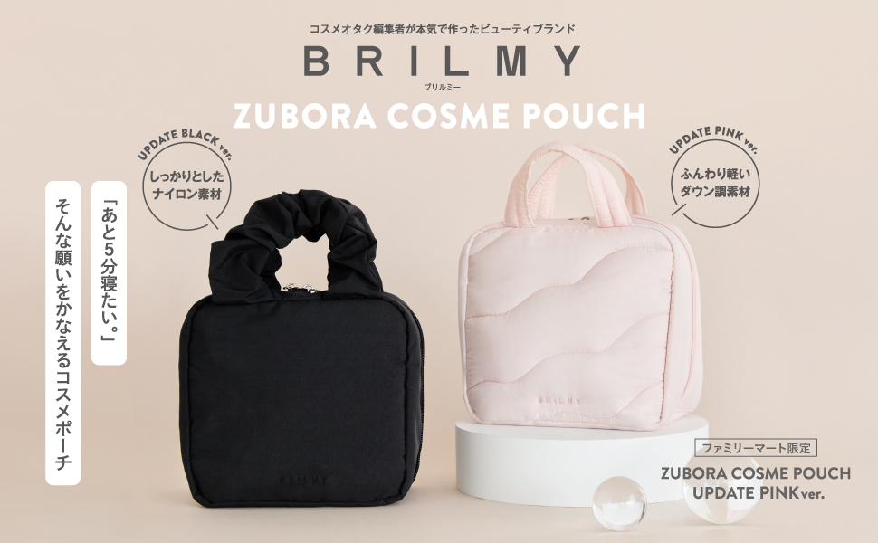 「BRILMY」は、コスメオタク編集者が立ち上げた宝島社発のビューティブランド。「ズボラに優しいコスメポーチBOOK UPDATE BLACK ver.」は、ブランド誕生一周年を記念して発売されたムック本です。付録に選ばれたのは“あと5分寝たい”というズボラの願いを叶えてくれる「ズボラコスメポーチ」。BRILMYのムック本・第一弾で大人気だったアイテムが、さらに使いやすくアップデートされました。