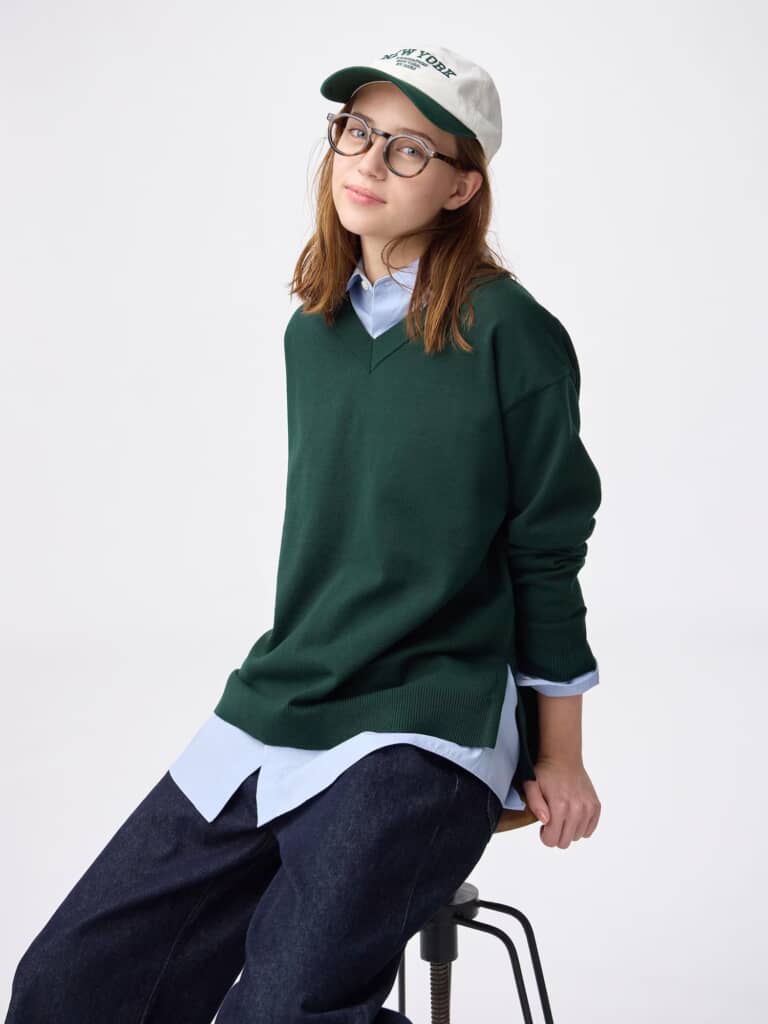 ユニクロの「クルーネックベスト」は、スポーティなラインがアクセントになった、1枚でもレイヤードスタイルでも楽しめるベスト。ふくらみ感のある肌ざわりの良い素材が使用されており、着心地も快適です。ややゆったりとしたフィット感で、リラックスした印象が魅力。カラーは01 OFF WHITE・55 GREEN・69 NAVYの3種類で、価格は1290円で販売されています。