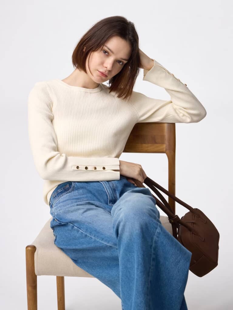 第2位は「ケーブルメタルボタンカーディガン(半袖)」でした。クラシカルなケーブル編みにメタルボタンをあしらったショート丈カーディガンです。前中央にはきらりと光る五つのメタルボタンを配し、上品さをプラス。タイトすぎないすっきりシルエットに短め丈なので、ハイウエストパンツやフレアスカートなど、合わせるボトムスを選びません。また重ね着してももたつかない絶妙なサイズ感でオン・オフ問わず着まわしやすいのが魅力です。カラーは4種類、価格は1990円で販売されています。