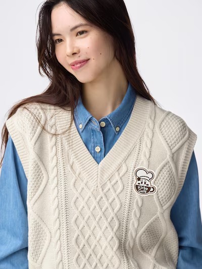 GUから販売されている「ケーブルニットベスト Kirby」が、シンプルで着心地がよくどんなコーディネートにも合わせやすいのに、かわいいキャラクターコラボ商品だと高評価を集めています。