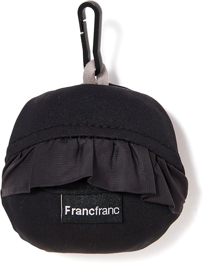 フランフランの「くしゅらくエコバッグ フリル ブラック」は、コンパクトさとかわいさ、そして使いやすさを兼ね備えたエコバッグです。くしゅくしゅっと押し込むだけで丸められる簡単収納仕様で、エコバッグにありがちな「たたむのが面倒」を解決。最大の特徴は、手のひらサイズになる高い携帯性。付属のカラビナで普段使っているバッグにさっと取り付けることができるため、邪魔にならず常備できます。