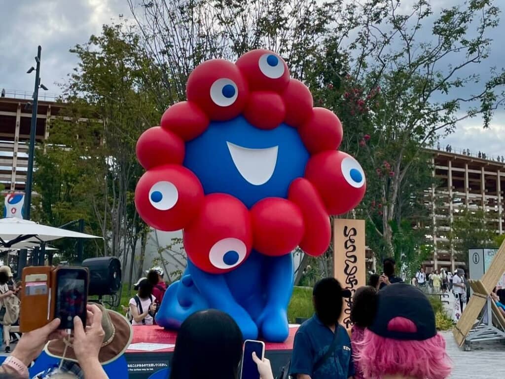 東ゲート付近に設置されたミャクミャク像は、「いらっしゃいませ」と書かれた立て看板の横で正座し、手をついているポーズが印象的です。まるで歓迎しているかのような姿がかわいらしく、後ろ姿からのぞく足元も愛嬌たっぷり。思わず写真を撮りたくなる注目スポットです。
