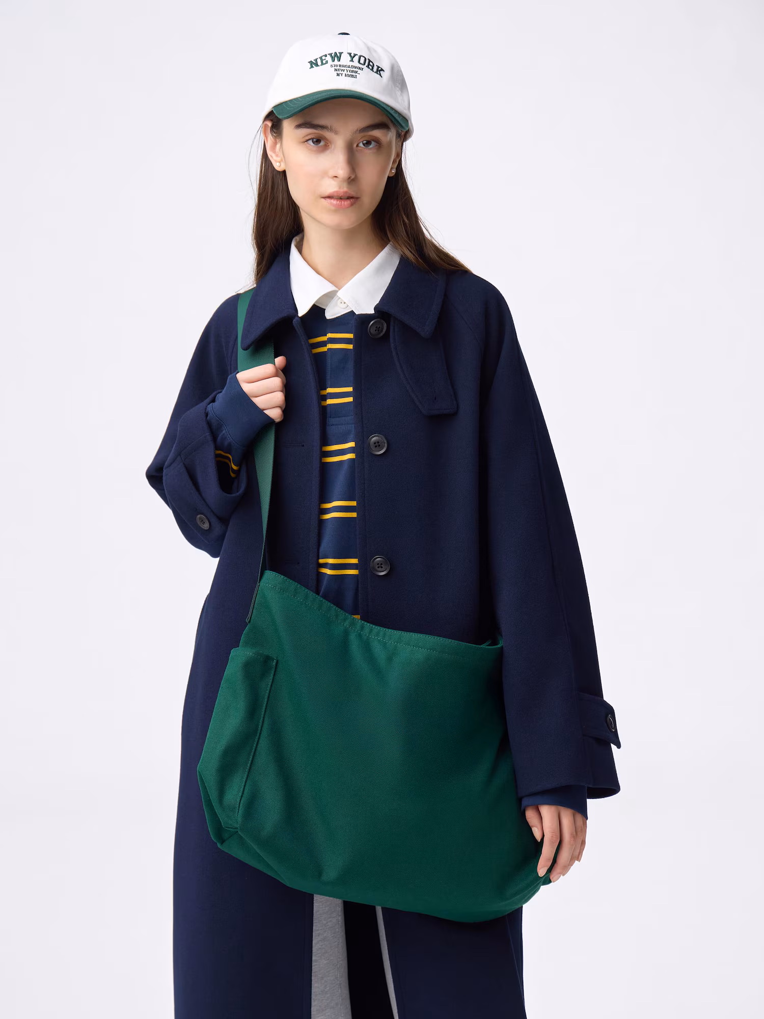 GUから販売されている「キャンバスショルダーバッグ+E」が、大容量で通勤や通学に便利だと人気を集めています。トレンド感があってコスパも良いと好評のようです。