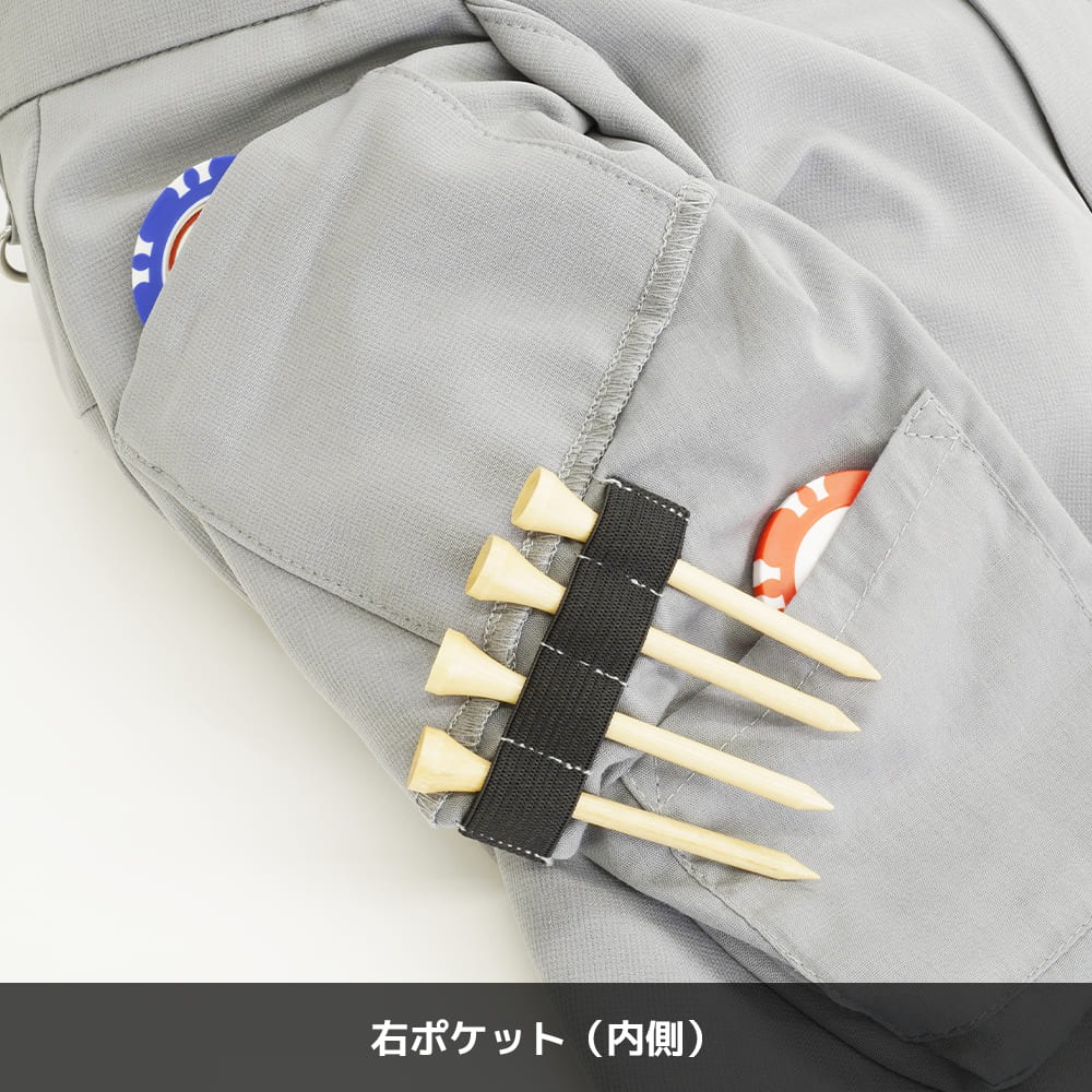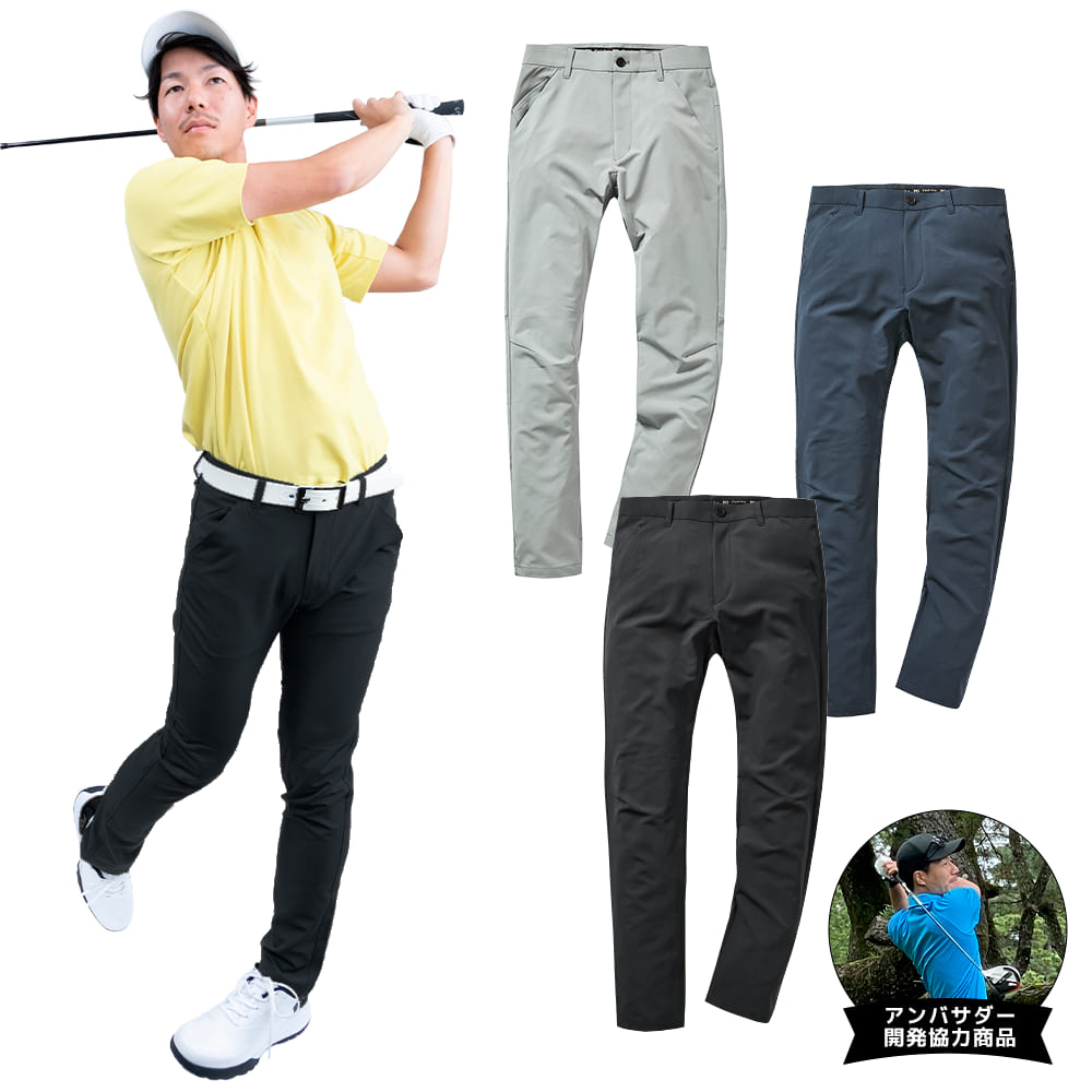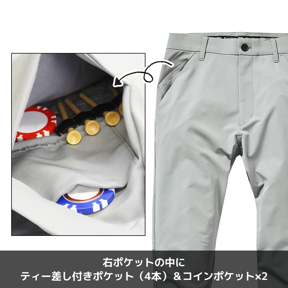 さらにポケット内にティー差し4本分、D環付きといった細やかな工夫も備えています。カラーはブラック・グレー・ネイビーの3色、サイズはM〜3Lまで展開。オールシーズン活躍できる機能性とシンプルなデザインで、練習からコースまで幅広く対応するパンツです。