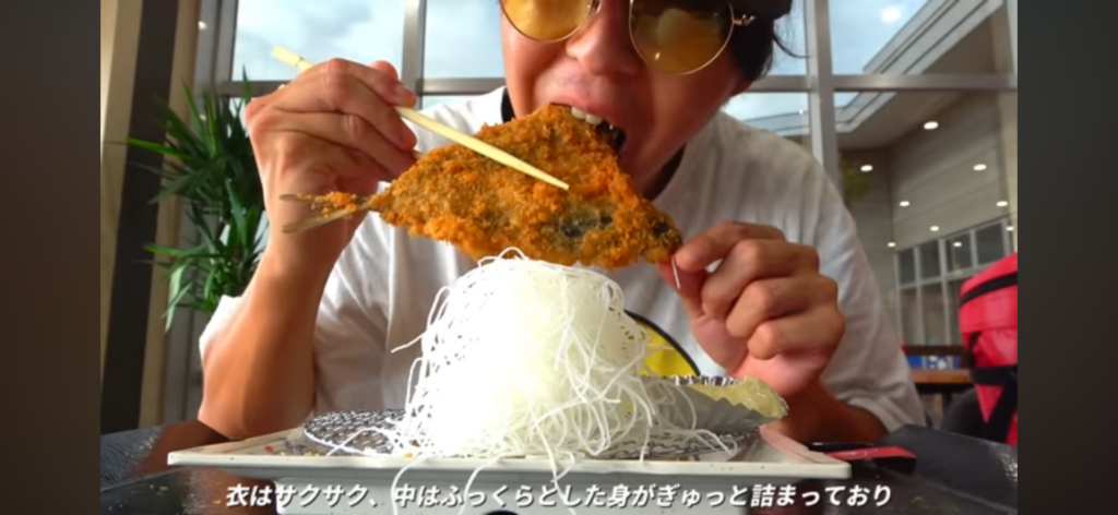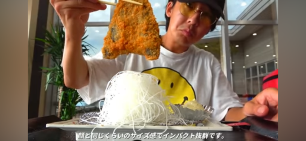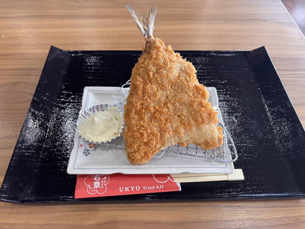 「ジャンボアジフライ」は、今年の7月にオープンした「あじフライの右京」が提供する巨大なアジフライです。サイズはレギュラー、ビッグ、ジャンボの三種類から選べて、ジャンボサイズの大きさは一般的な男性の顔よりも大きいほどです。新鮮なアジの本来の風味を保つためにきめ細かいパン粉で包んで揚げるのがこだわりとのこと。席からは海が見える好ロケーションとなっています。