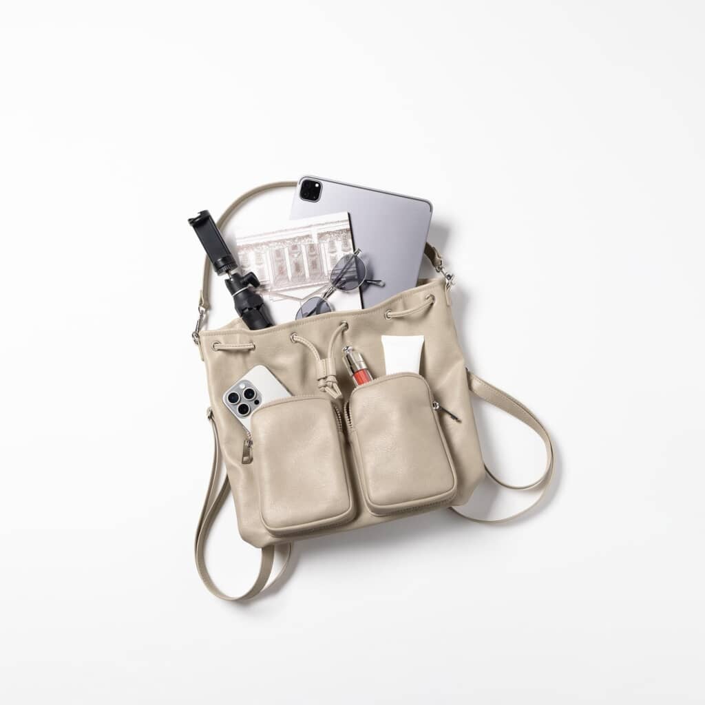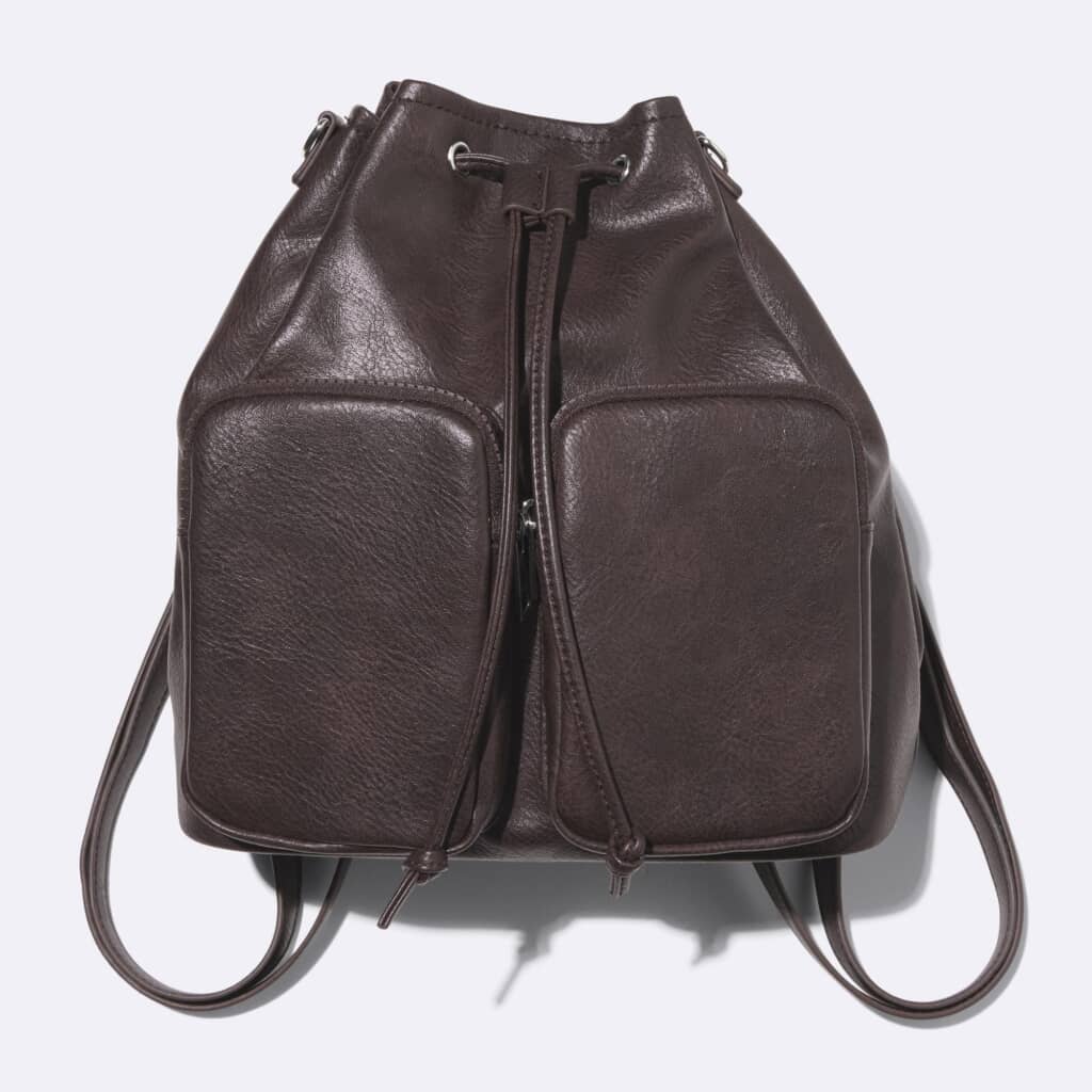 GUの「ポケットミニバックパック」は、外側と内側の両方にポケットが付いており、小物の整理や収納に便利な巾着型リュック。ファスナー付きの外ポケット二つがデザインのアクセントになっており、実用性とデザイン性を兼ね備えています。マグネットとヒモで開閉でき、取り外し可能なハンドルも付いているので、手持ちでも使いやすい仕様。サイズは縦30×横26×マチ12センチ(約)で、重量は約435グラムと日常使いに適した軽さも魅力です。カラーは09 BLACK・30 NATURAL・38 DARK BROWNの3種類、価格は2990円で販売されています。なお、2025年9月30日時点で09 BLACK・38 DARK BROWNの2カラーはオンライン品切れ中なので、再入荷通知を設定しておくのがよさそうです。