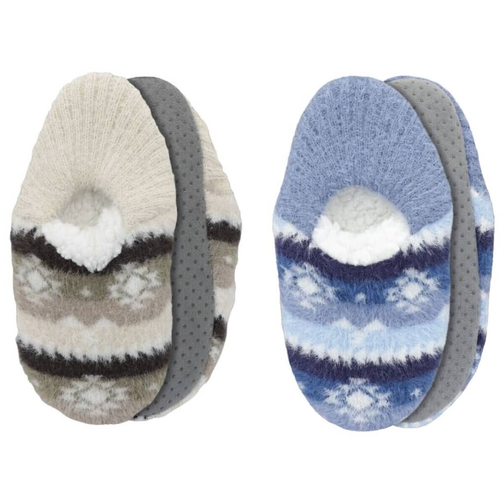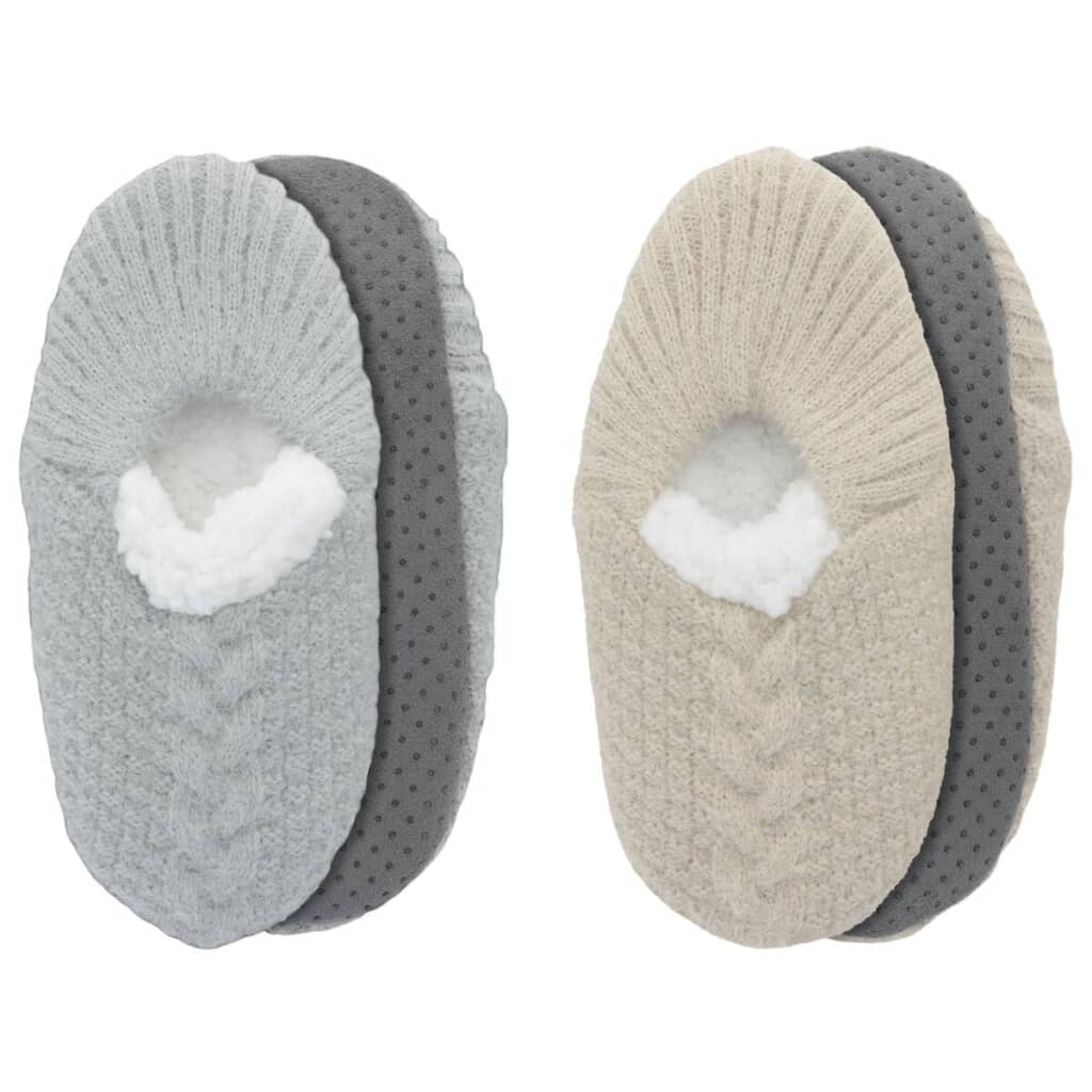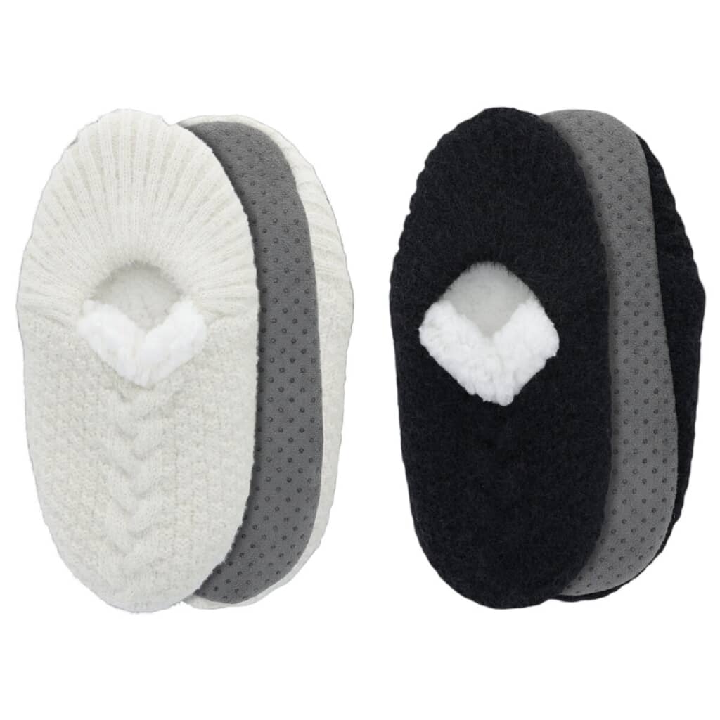 米国発のソックスブランドK.BELL(ケーベル)が手がける「ケーブル スリッパ 2足組」は、ケーブル編み風の表情と、ふんわりと足先を包むボア裏地が特長です。足裏には滑り止め加工が施され、フローリングでも動きやすく脱げにくい設計です。サイズはS/M(22.0-23.5cm)、M/L(24.0-25.5cm)。カラーはホワイト/ブルー、ブラック/ホワイト、グレー/ベージュの組み合わせ。公式オンラインではクリアランス価格997円(1組当たり499円)の表示もあり、冬のまとめ買いにも適した実用派アイテムです。