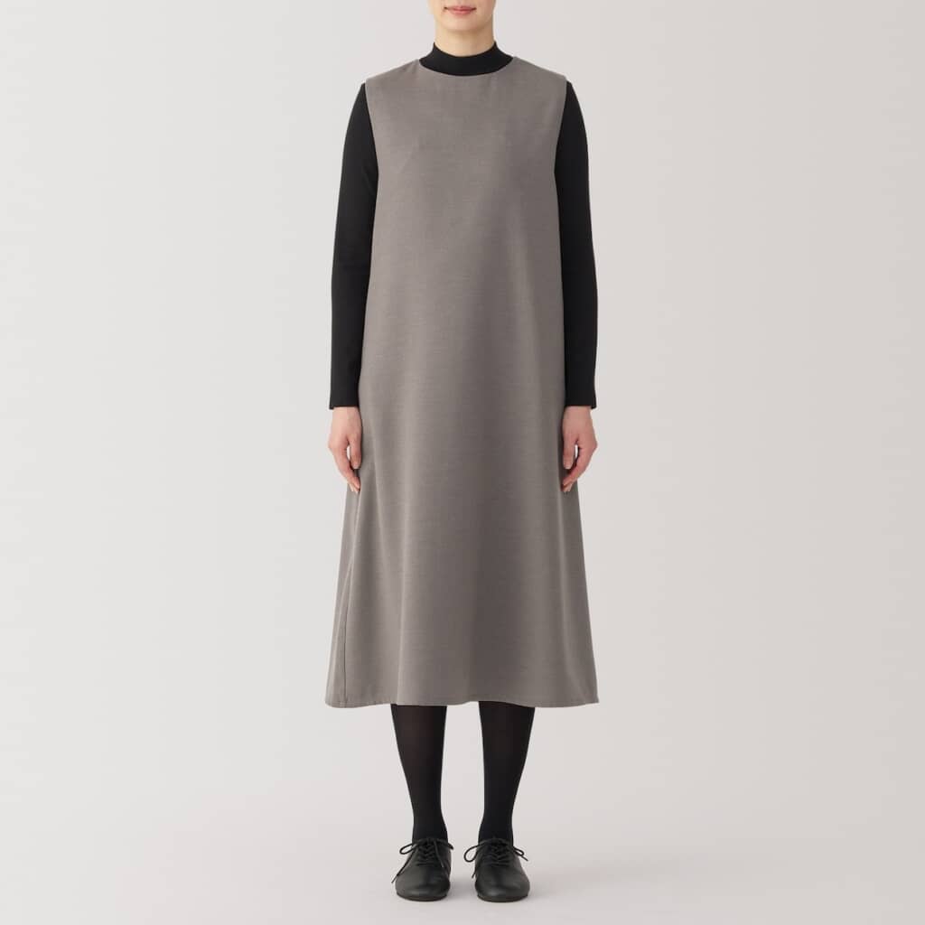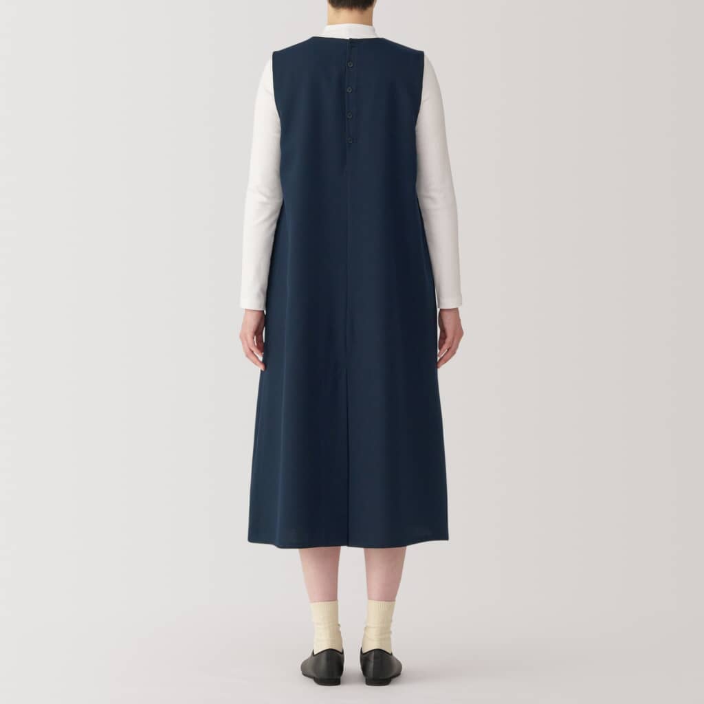 無印良品の「婦人 起毛 ジャンパースカート」は、ウールを取り入れた素材で仕立てたあたたかみのあるジャンパースカート。チクチク感を軽減するよう素材を見直しており、自宅で洗える扱いやすさも魅力です。デザインはすっきりとしたクルーネックのAラインで、背中に施したボックスプリーツが足さばきを良くし、動きやすいのも魅力。背面に並ぶ五つのボタンは着脱を助けるだけでなく、デザインのアクセントにも。アームホールを広めに取り、中にニットを重ねても快適に着られる工夫がされています。カラーはダークネイビー・ボルドー・ブラウンの3種類、2025年9月30日時点でセール価格の税込み4990円で販売されています。