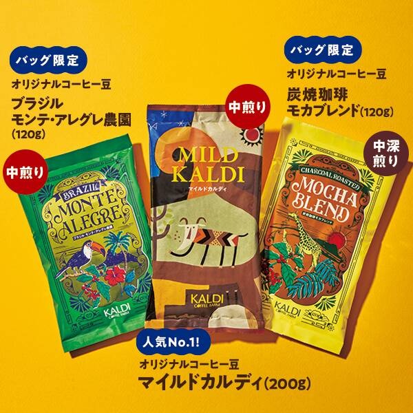 コーヒーは、カルディ人気ナンバーワンの「マイルドカルディ」に加え、エチオピア産モカの華やかな香りに炭焼きの香ばしさが魅力の「炭焼珈琲モカブレンド」、青リンゴやローストアーモンドのような風味が特徴の「ブラジル モンテ・アレグレ農園」というバッグ限定の2つを含めた3種類がセットになっています。コーヒーはフィルター用に挽いた「粉」と「豆」から選べるので、好みに合わせて楽しめるのもうれしいポイントです。