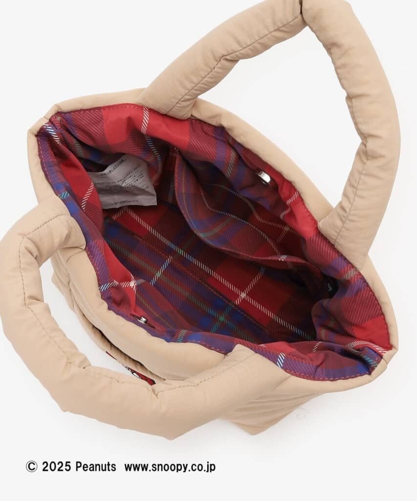 アフタヌーンティーリビングの「中綿ミニトートバッグ/PEANUTS/Afternoon Tea Original Tartans」は、フロントにダウンを着たもこもこなスヌーピーの刺繍が施され、中綿入りでふっくらとした優しい手触りが魅力のミニトートバッグ。ベージュの落ち着いたカラーと内側の赤チェック柄が程よいアクセントになっており、秋冬のコーディネートにほどよいアクセントを添えてくれます。コンパクトで持ち運びしやすく、内ポケット付きで小物の整理にも便利。マグネットボタン式で開け閉めしやすいのもうれしいポイントです。