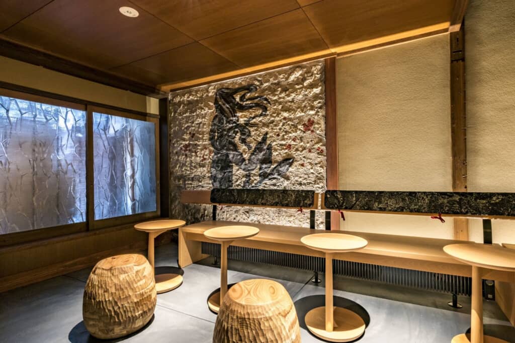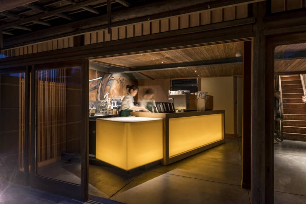 歴史ある建物の外観は残しつつ、既存の空間を生かして刷新された内装はまさにこの地ならでは。店内には畳の間が3カ所用意され、和紙を使用したアートや西陣織と同じ技法で織られたファブリックなどのインテリアも特徴的。ここでしか味わえないコーヒータイムを過ごすことができるでしょう。