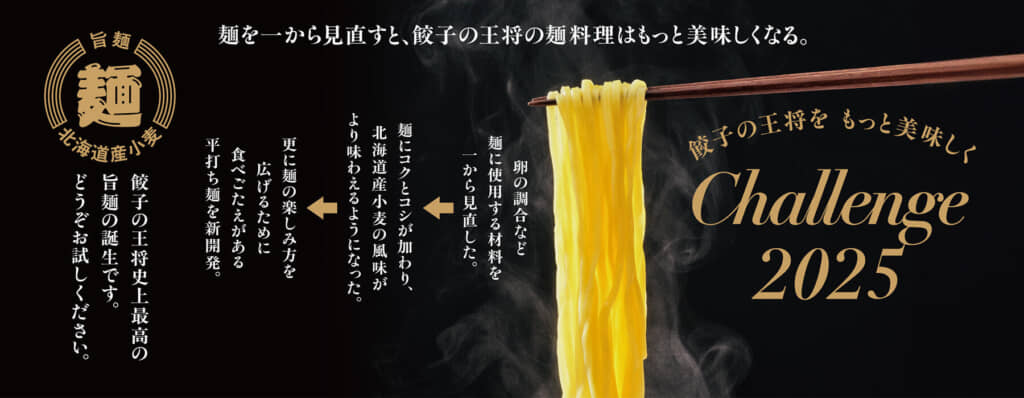 料理の品質向上を目指す同店では、「餃子の王将をもっと美味しく Challenge 2025」と題し、麺のリニューアルを実施。使用する卵の調合や、小麦粉の練り具合などから見直すことで、弾力とコクのある麺を実現したほか、スープに良く絡む平打ち麺を新たに開発し、ラーメンや天津麺といった人気メニューにも取り入れています。