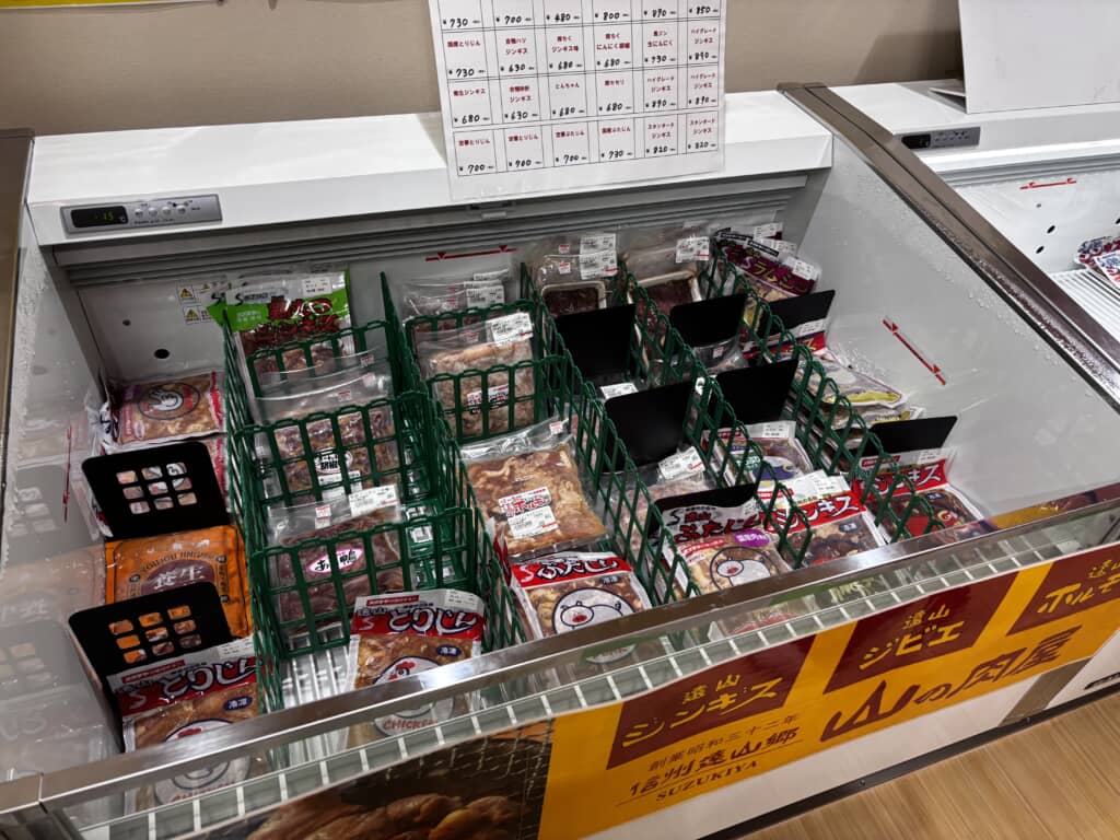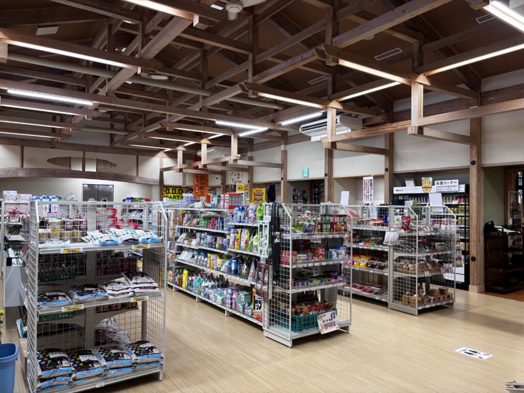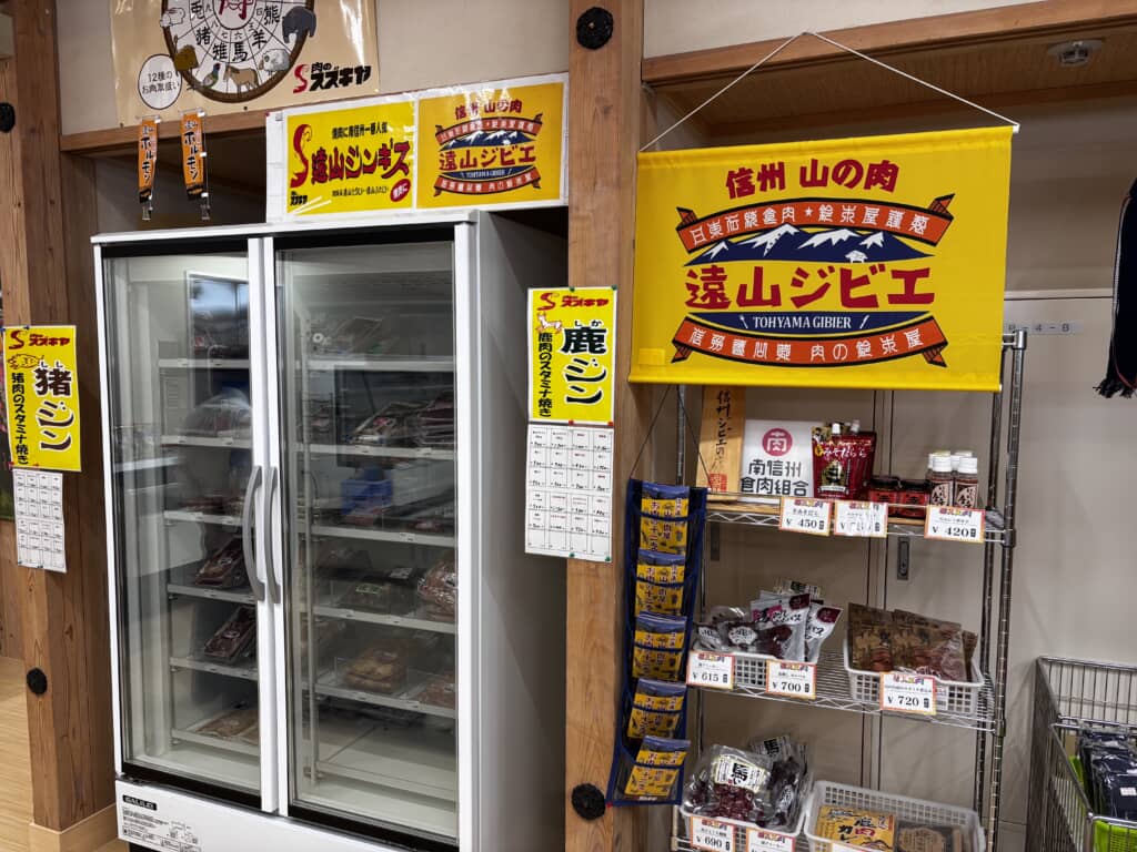 また、直売所の隣には併設のスーパー「ヨシマルヤストアー」が入っているのも珍しいポイントです。ここでは先ほどの、名物「遠山郷バーガー」が販売され、熊肉、ウサギ肉、鹿肉といった珍しいジビエも販売されています。お土産品というよりは総菜、野菜、生活用品など、地元の人が利用しやすいお店になっています。