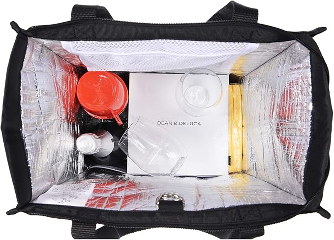 DEAN & DELUCAらしい上品なブラックにロゴを配した「ショッピングカート」は、見た目と機能を両立したカートタイプの保冷バッグです。広げた状態のサイズは約高さ51.5x幅31.5xマチ20cm、たたんだ状態は約高さ21x幅31.5xマチ7.5cm。地面から持ち手までの高さは約85cmで、肩掛けとしても使えます。内側はアルミ蒸着で保冷・保温に対応し、保冷剤や小物を入れられるメッシュポケット付き。