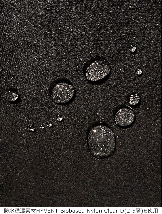 片手で操作できるアジャスター付きフードは、フィット感が良く視界を妨げにくい設計です。素材には環境負荷の少ない植物由来のナイロンを一部使用し、ビーズ加工を施しているため、肌触りがさらりとしており、汗をかいてもベタつきにくい着心地となっています。
