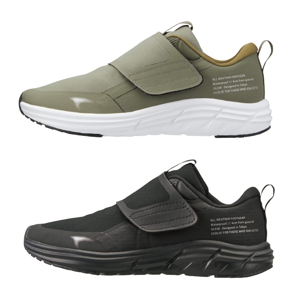 最大の特徴は、接地面から約4cmまで対応する防水性。水たまりやぬれた路面でも水が染み込みにくく、急な雨にもしっかり対応してくれます。アッパー部分には大型の面ファスナーを採用。甲部分をしっかり覆ってくれるため、雨水の侵入をガードしてくれる構造になっています。