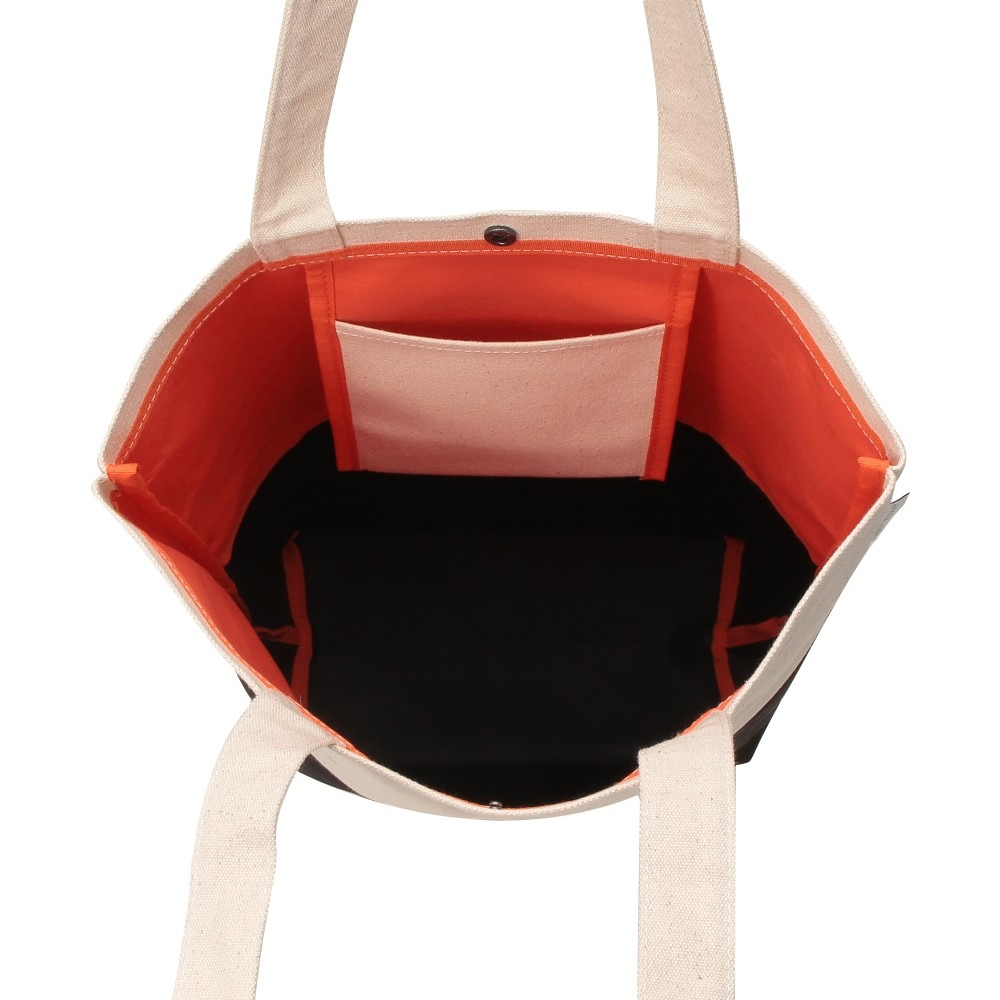 開口部にはホックがついており、中身が見えにくく安心感もプラス。また、バッグの内側には鮮やかなオレンジのコーティングがされているのもポイントです。多少の汚れがついてもさっと拭き取ることができるので、安心して普段使いできそうですね。