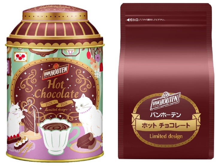 バンホーテンの「ホット チョコレート 2025-2026 リミテッドデザイン缶(150g)」は、白猫を主役にしたクラシカルな印象の円筒缶に、濃厚なホットチョコレートを詰めた数量限定アイテムです。ホットチョコレートは、ピュアココアをベースにチョコレートパウダーを配合しており、本格的な味わいが楽しめます。中身は保存に便利なジッパー付きアルミ袋入り。缶サイズは直径92ミリ×高さ141ミリで、飲み終えた後に小物入れとしても活用できます。かわいらしい白猫たちが戯れる姿は、猫好きにはたまらないデザインといえるでしょう。発売日は2025年10月21日、価格は税込1080円です。