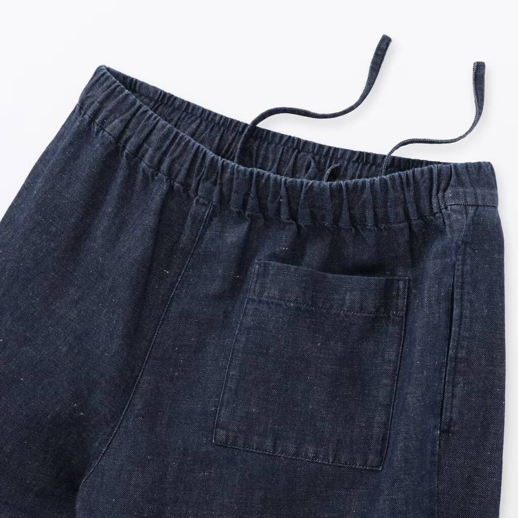 「婦人 コットン リネン デニムイージーワイドパンツ」は、軽やかさとゆとりを兼ね備えたワイドパンツ。素材はオーガニックコットンとリネンの混紡デニムで、丈夫でハリがありながらも、使い込むほどに柔らかく肌になじむ風合いが魅力です。デザインは、どんなトップスにも合いやすいベーシックなスタイルで、シンプルながらも存在感があり、タックやシルエットで体型を程よくカバーする要素もあり好評です。