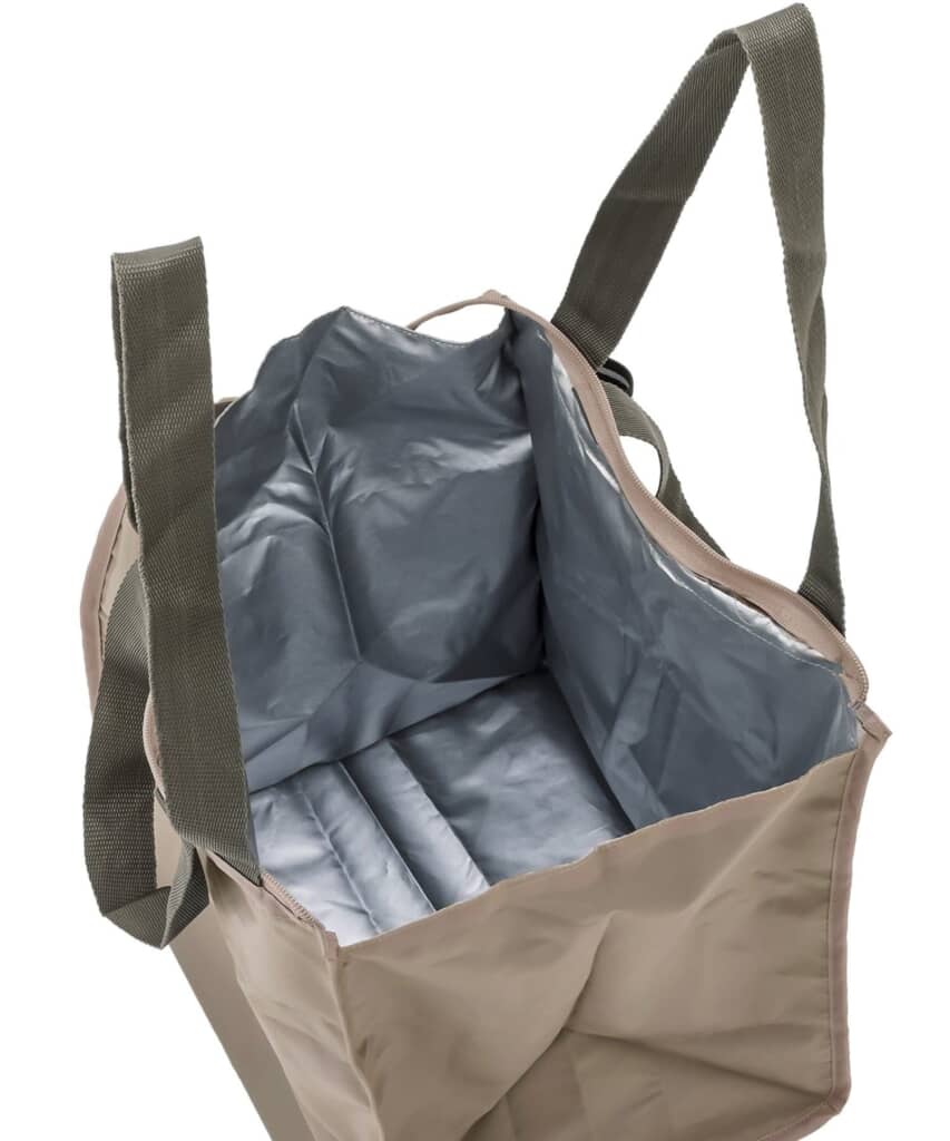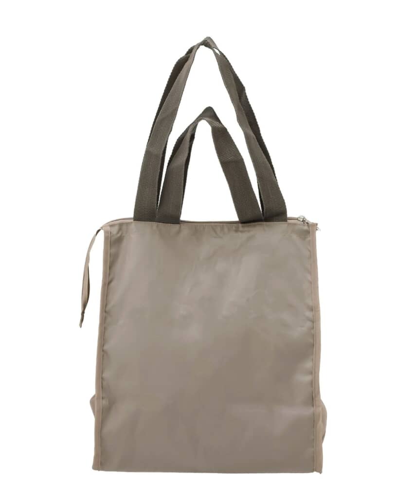 3COINSの「マチ広保冷スクエアエコバッグ」(税込み:880円)は、見た目以上にたっぷり入る大容量のエコバッグ。マチが広く設計されているため、お弁当や食品パックも横にして収納できるのがうれしいポイントです。内側にはアルミコーティング素材が使用されており、保冷効果が期待できるのも魅力。ゴムバンド付きでコンパクトに折りたたむことができるので、持ち運びにも便利です。耐荷重は約5キロ、ファスナーを開いた状態での容量は約21.5リットルあるので、重たいものや大きなもの、大量な買い出しの際にも活躍してくれそうですね。カラーはグリーンとベージュの2種類をラインアップしています。