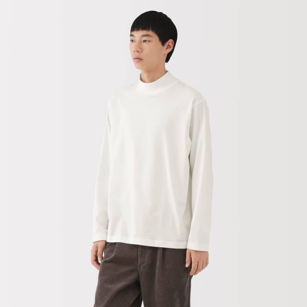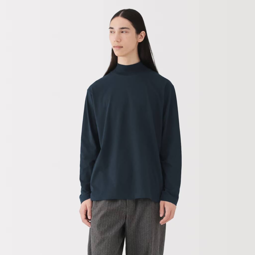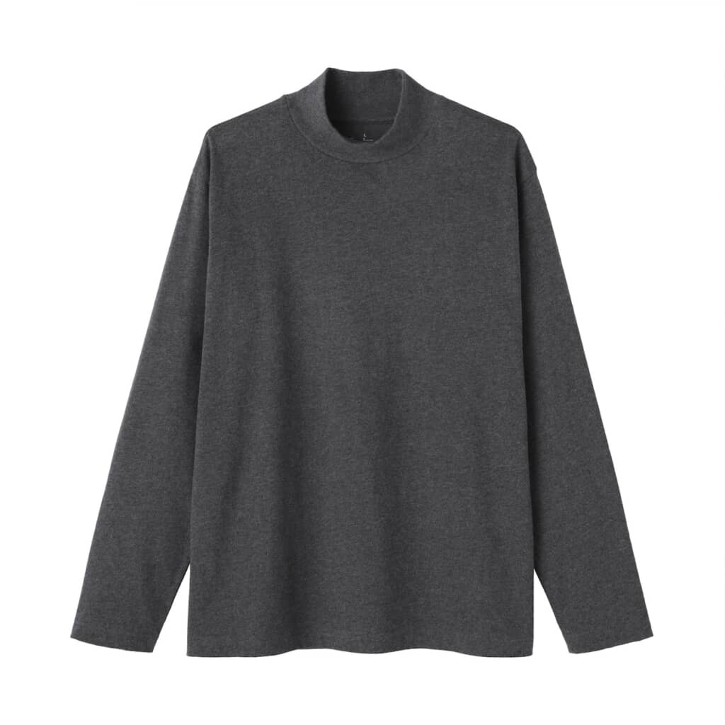 秋冬のインナーに迷ったら、無印良品の「紳士 起毛ハイネック長袖Tシャツ」がおすすめです。綿の心地よさに起毛加工を施し、なめらかな肌触りとあたたかさを両立し、直線的なボックスシルエットで一枚でも重ね着でも決まると好評です。