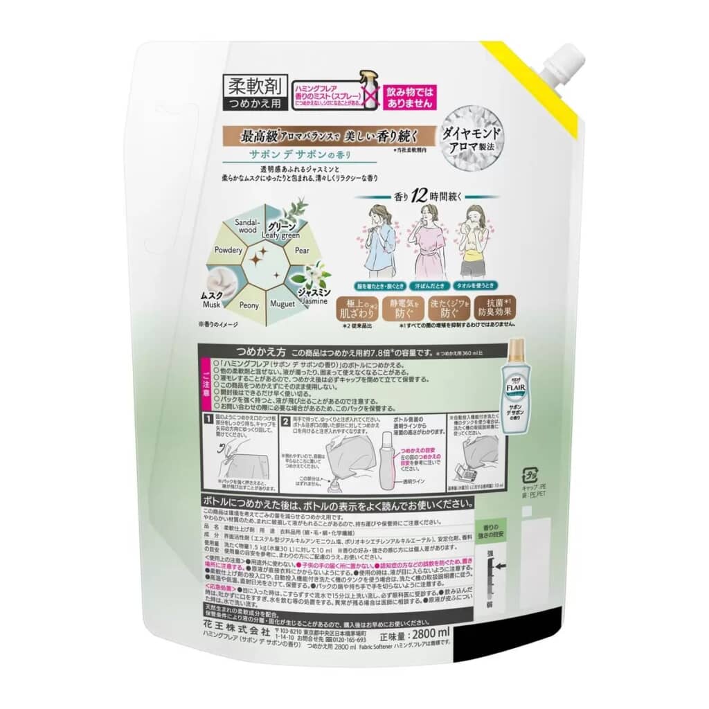 「ハミング フレア サボンデサボン 2800ml」(1528円)は、透明感のある石鹸系の香りをまとわせながら、静電気防止やシワ軽減、防臭などの機能も備えた大容量柔軟剤。アロマのバランスに配慮されており、やわらかく包み込むような香りが自然に続きます。長期間使える量を確保できるため、買い物の回数を減らしたいユーザーにおすすめです。