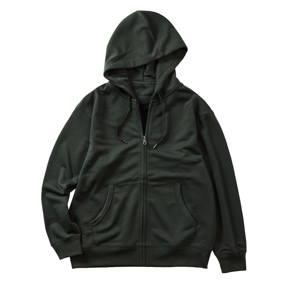 第2位の「ミドルウエイト裏毛フルジップフーディ」は、秋から春まで活躍する裏毛スウェット生地を使った定番の羽織りです。体温調節しやすいフルジップに、フィットを整えられるひも付きフード、両サイドポケット、袖口と裾のリブで着心地も良好。無地のシンプルデザインはデニムやチノとも相性が良く、幅広い年代に似合います。素材は本体ポリエステル100%でケアも手軽。カラーはホワイト、ブラック、杢グレー、キャメル、ピンク、ダークグリーン、サイズはM〜3L、価格は税込1500円とコスパも魅力です